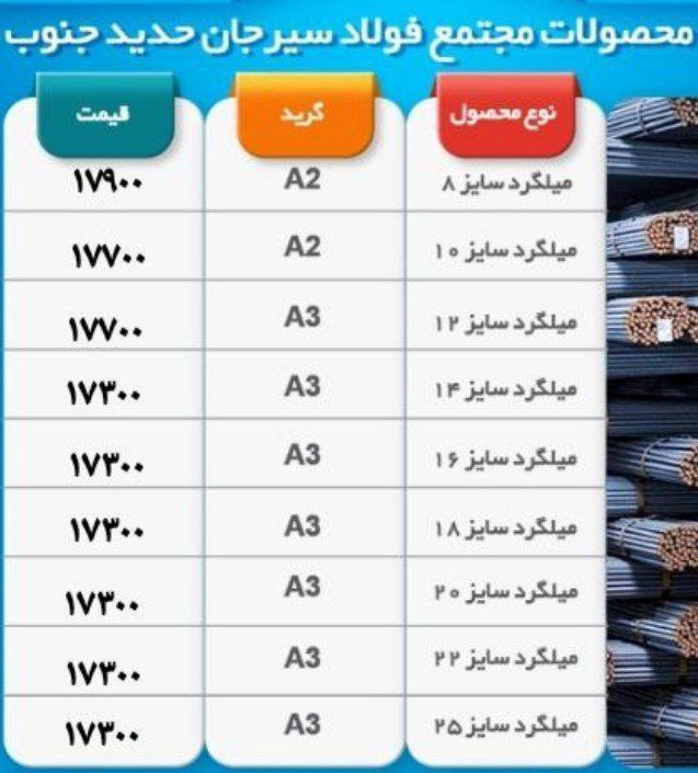 میلگرد کارخانه شاهین بناب میلگرد آجدار A2 سایز 8 : 202000 میلگرد آجدار A2 سایز10: 199000 میلگرد آجدار A3 سایز 12 : 199000 میلگرد آجدار A3 سایز 14الی 32 19600 ...