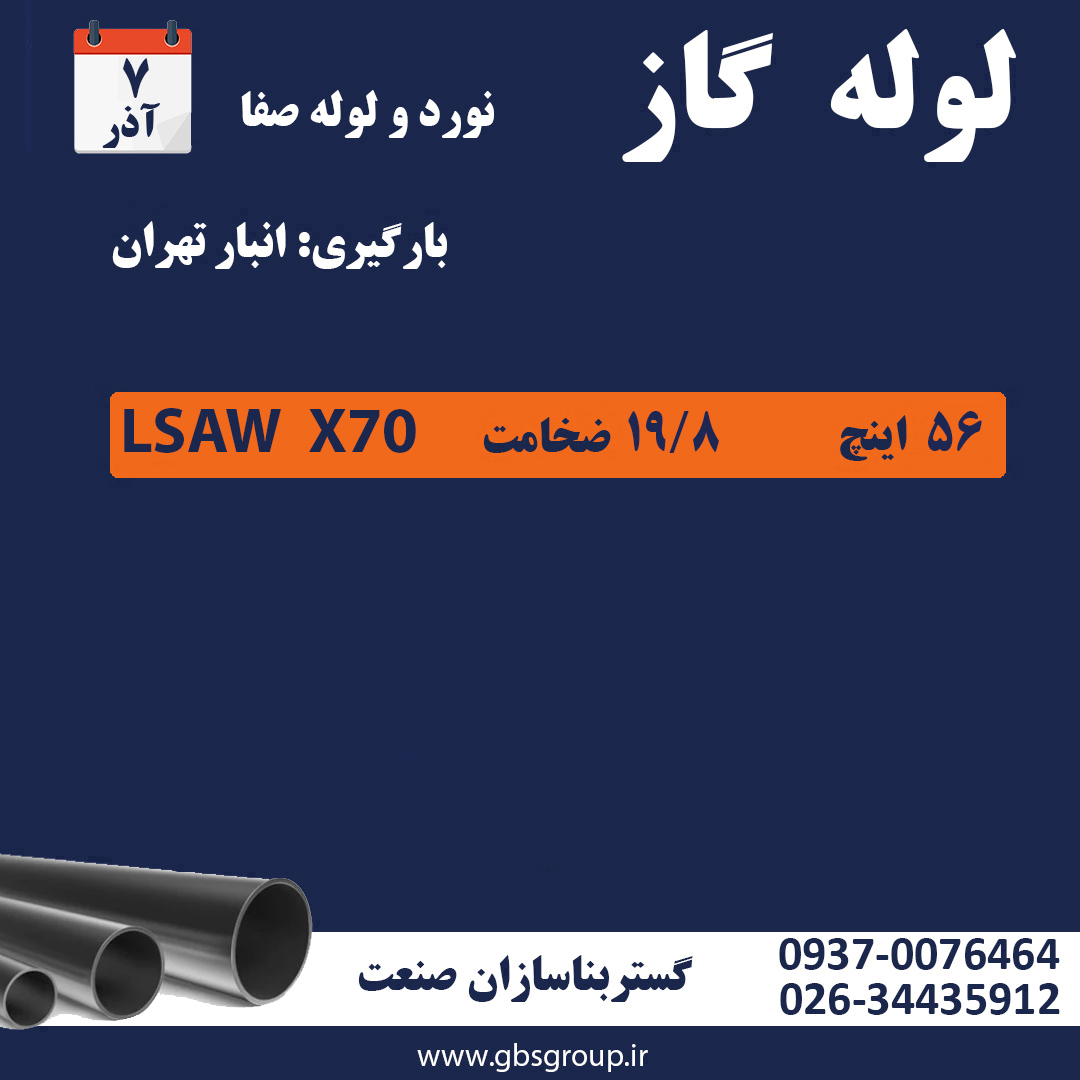 لوله گاز LSAW. X70 تولید : شرکت نورد و لوله صفا ۵۶ اینچ ۱۹/۸. ضخامت اطلاعات تماس ۰۹۳۷۰۰۷۶۴۶۴ فرهنگ شرکت گستربناسازان صنعت www.gbsgroup.ir