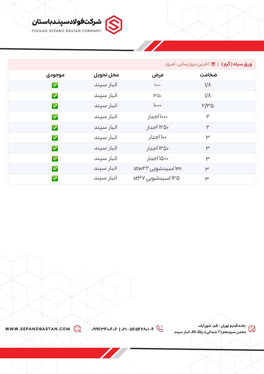 ⚜️فولاد سپند باستان ⚜️🌀عرضه کننده انواع ورق های فولادی ✅ ورق سیاه ✅ ورق روغنی ✅ ورق گالوانیزه و رنگی 💢برای اطلاع از قیمتها تماس بگیرید .📱 تلفن های واحد فروش: ☎️ ...