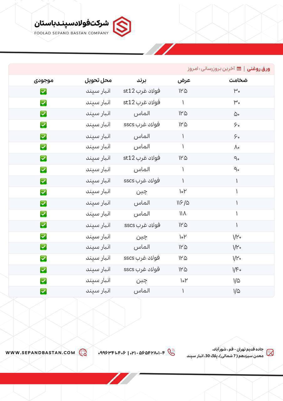 ⚜️#فولاد_سپند_باستان ⚜️ 🌀عرضه کننده انواع ورق های فولادی ✅ ورق سیاه ✅ ورق روغنی ✅ ورق گالوانیزه و رنگی 💢برای اطلاع از قیمتها تماس بگیرید . 📱 تلفن های وا ...