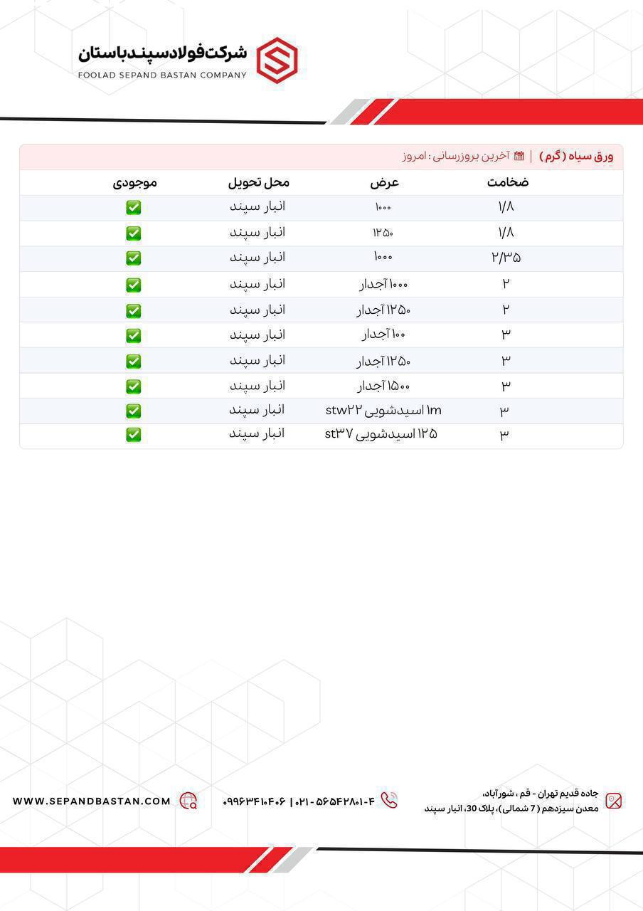 ⚜️فولاد سپند باستان ⚜️🌀عرضه کننده انواع ورق های فولادی ✅ ورق سیاه ✅ ورق روغنی ✅ ورق گالوانیزه و رنگی 💢برای اطلاع از قیمتها تماس بگیرید .📱 تلفن های واحد فروش: ...