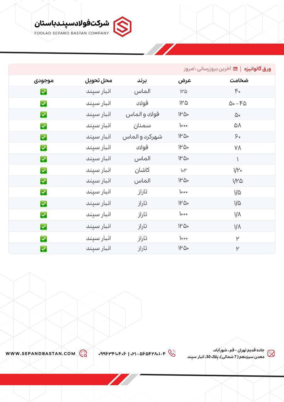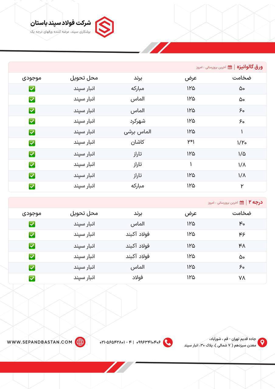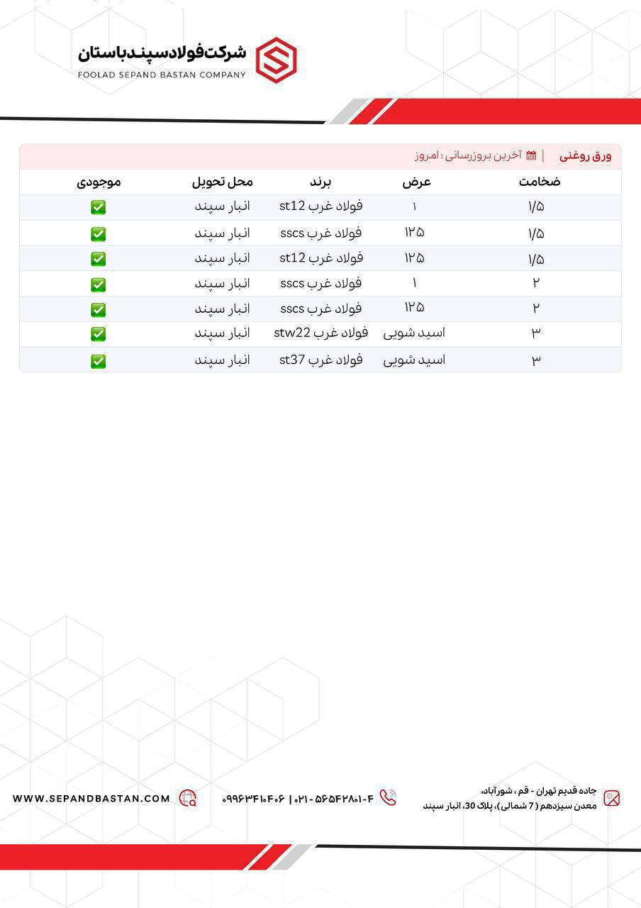 ⚜️#فولاد_سپند_باستان ⚜️🌀عرضه کننده انواع ورق های فولادی ✅ ورق سیاه ✅ ورق روغنی ✅ ورق گالوانیزه و رنگی 💢برای اطلاع از قیمتها تماس بگیرید .📱 تلفن های واحد فروش: ...