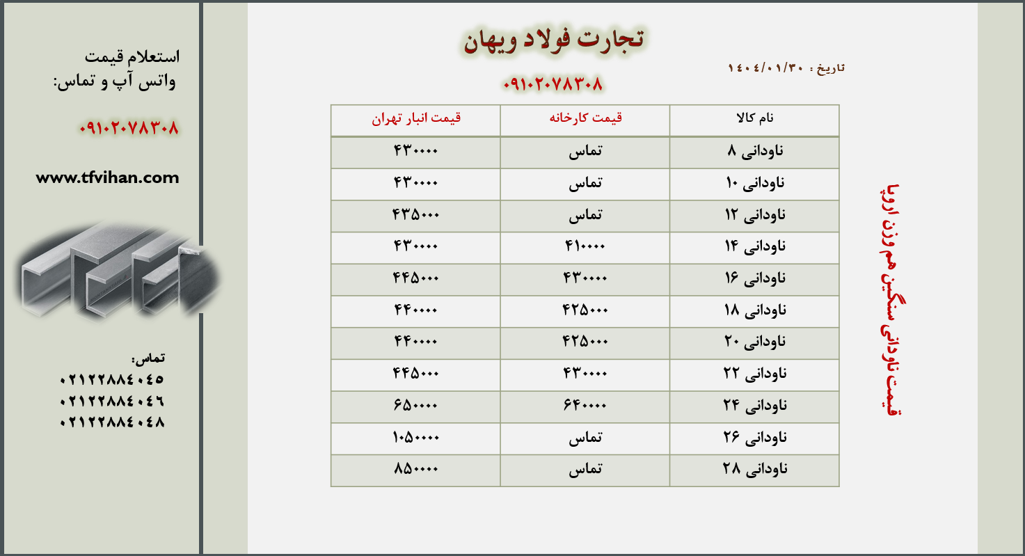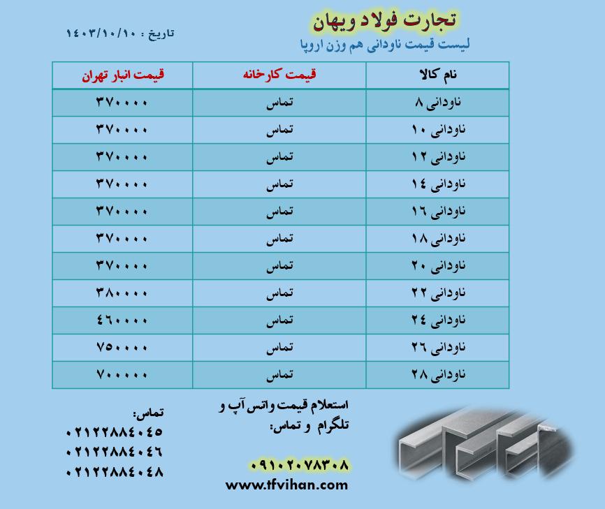 💫 هو الرزاق 💫 ⚜️ تجارت فولاد ويهان ⚜️ قیمت انواع ناودانی موجود كارخانه و انبار درخشان تهران 1403/10/10 قيمت ناودانى هم وزن اروپا استاندارد DIN1026 استعلام ...