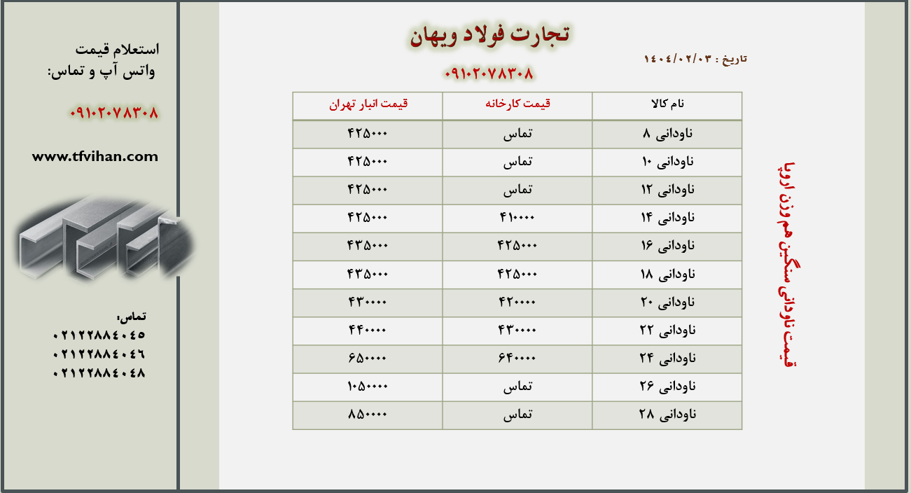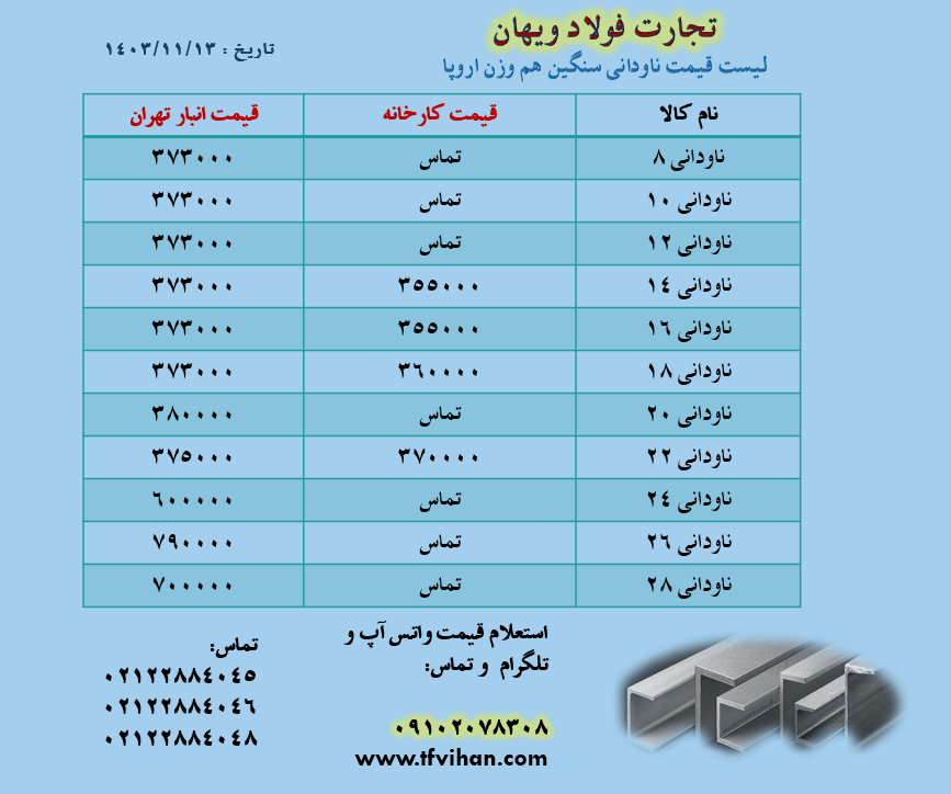 💫 هو الرزاق 💫 ⚜️ تجارت فولاد ويهان ⚜️ قیمت انواع ناودانی موجود كارخانه و انبار درخشان تهران 1403/12/01 قيمت ناودانى سنگين هم وزن اروپا استاندارد DIN1026 اس ...