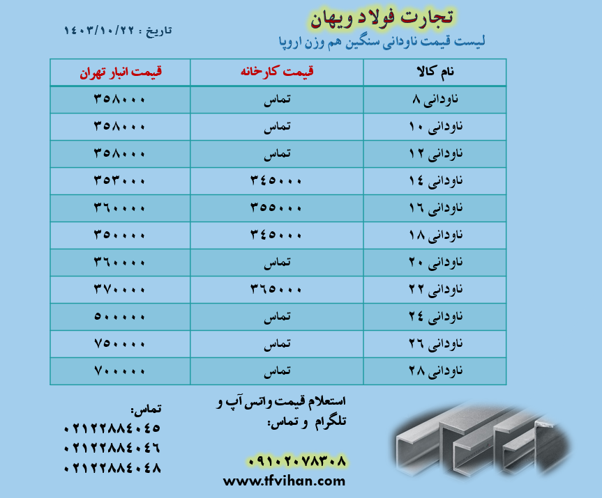یست قیمت ناودانی سنگین 💫 هو الرزاق 💫 ⚜️ تجارت فولاد ويهان ⚜️ قیمت انواع ناودانی موجود كارخانه و انبار درخشان تهران 1403/10/22 قيمت ناودانى هم وزن اروپا استا ...