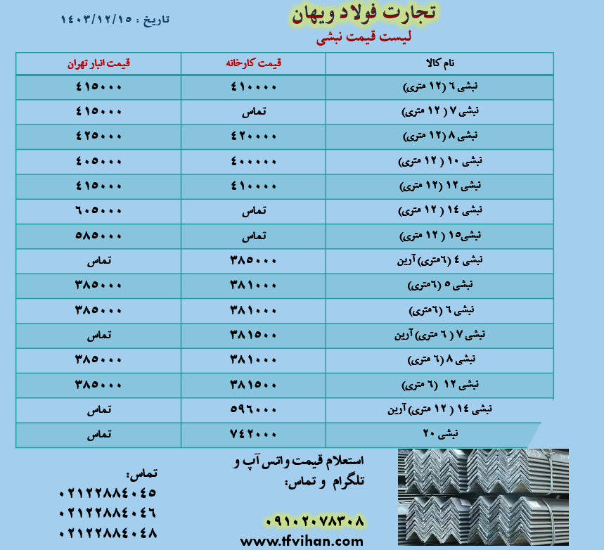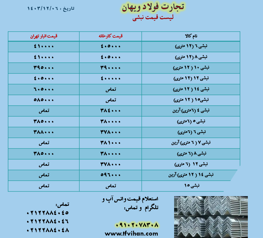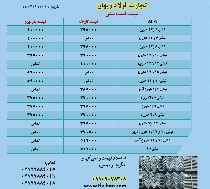 🔱 تجارت فولاد ویهان 🔱 ⚜️قیمت انواع نبشی موجود در (انبار تهران و درب کارخانه)⚜️ تاريخ. ١٤٠٣/٠٩/١٧ 🟣سایز نبشی🟣 💰قیمت تهران💰قیمت کارخانه💰 🔸🔸🔸🔸🔸 ...