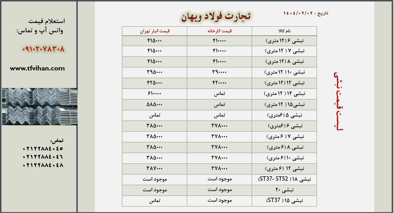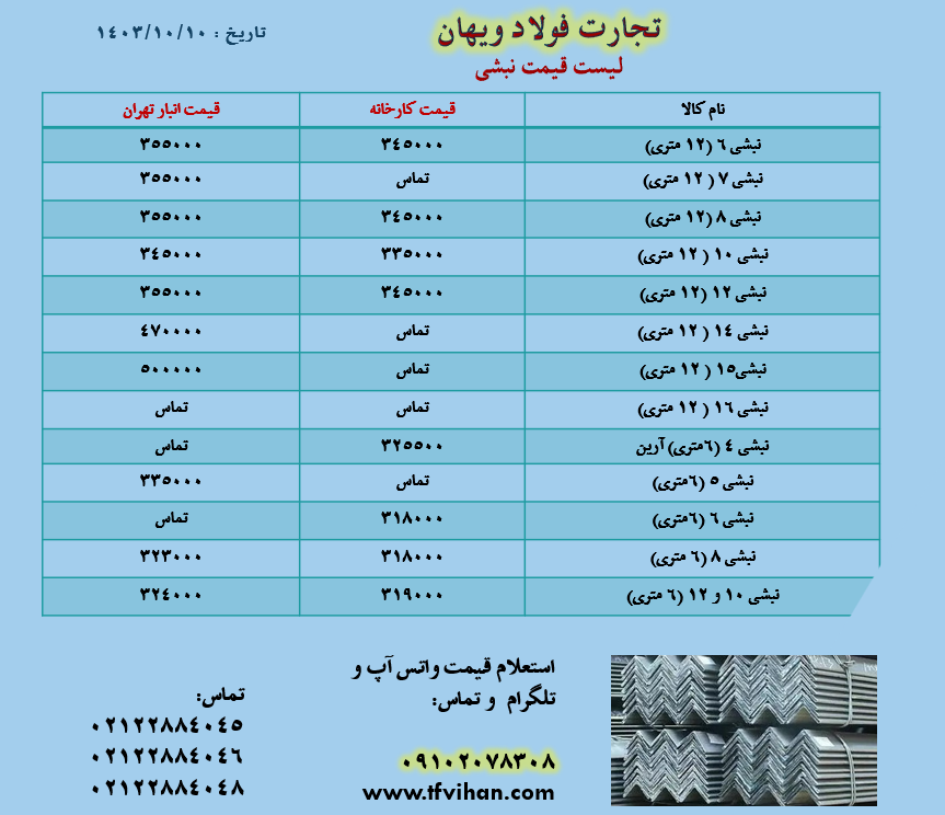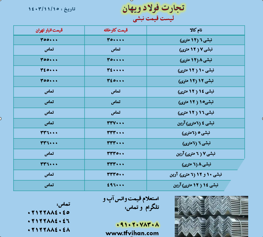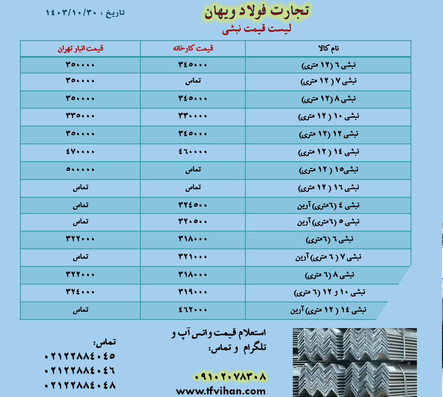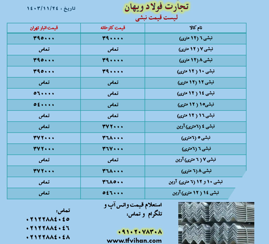 🔱 تجارت فولاد ویهان 🔱 ⚜️قیمت انواع نبشی موجود در (انبار تهران و درب کارخانه)⚜️ تاريخ شنبه ١٤٠٣/٠٨/٢٦ 🟣سایز نبشی🟣 💰قیمت تهران💰قیمت کارخا ...