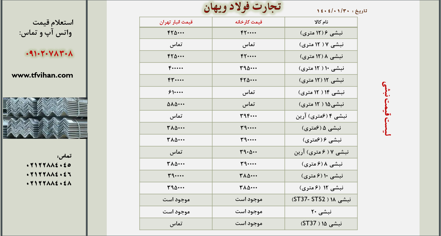 💫 هو الرزاق 💫 ⚜️ تجارت فولاد ويهان ⚜️ قیمت انواع نبشى موجودي كارخانه و انبار درخشان تهران 1403/11/15 استعلام قيمت و کسب اطلاعات بيشتر 📱📱 ٠٩١٠٢٠٧٨٣٠٨ خان ...