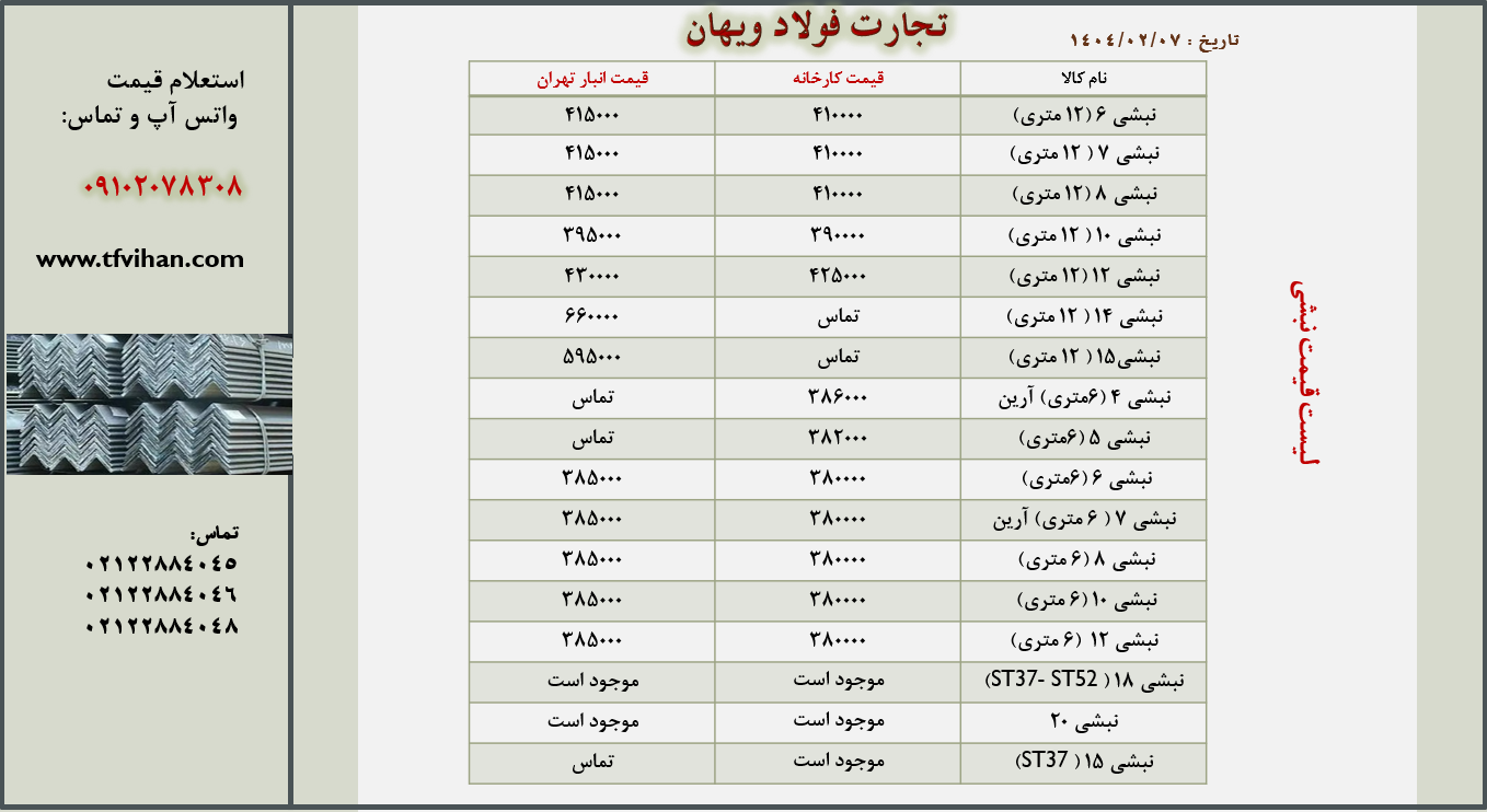 💫 هو الرزاق 💫 ⚜️ تجارت فولاد ويهان ⚜️ قیمت انواع نبشى موجودي كارخانه و انبار درخشان تهران 1403/10/30 ✅ انواع نبشى St37 - St52 - St44 موجود است استعلام قي ...