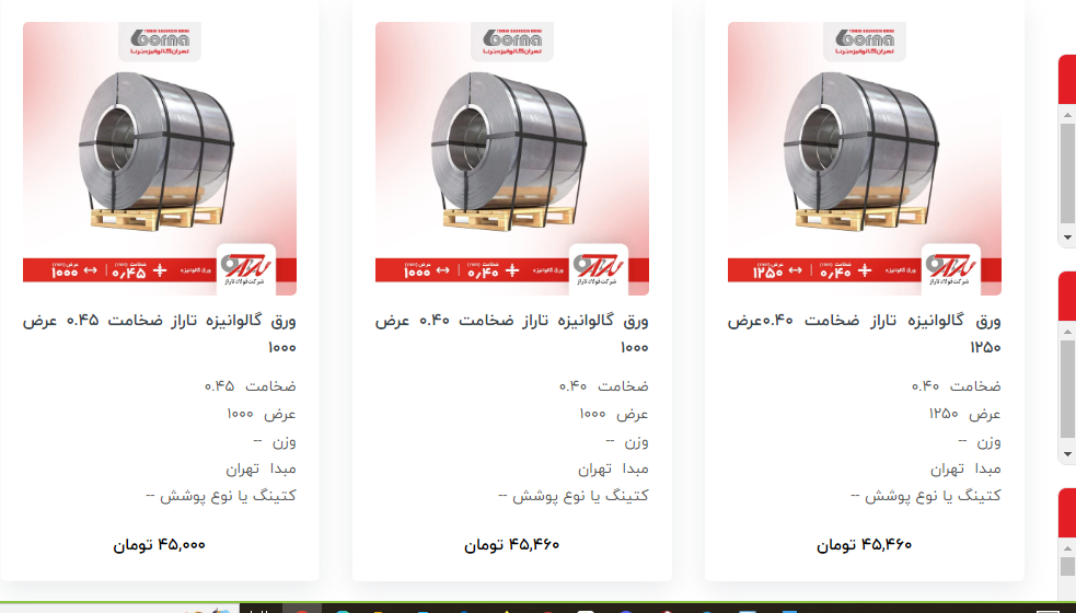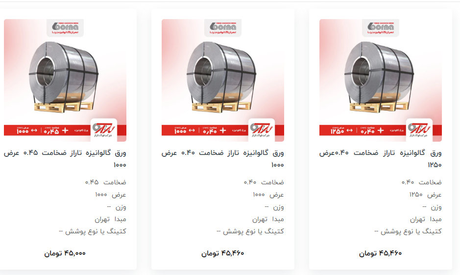#تهران_گالوانیزه_برنا ✅ ورق گالوانیزه تاراز 💬 ضخامت ۰.۴۰ عرض ۱۰۰۰ : ۴۵۴۶۰ تومان 💬 ضخامت ۰.۴۵ عرض ۱۲۵۰ : ۴۵۰۰۰ تومان 💬 ضخامت ۰.۶۰ عرض ۱۰۰۰ : ۴۴۱۰۰ تومان 💬 ضخامت ...