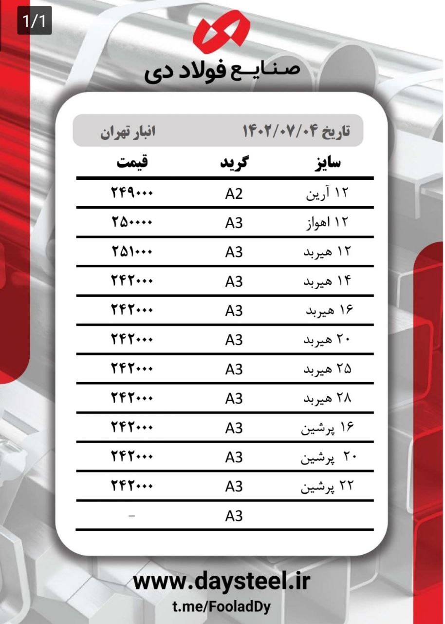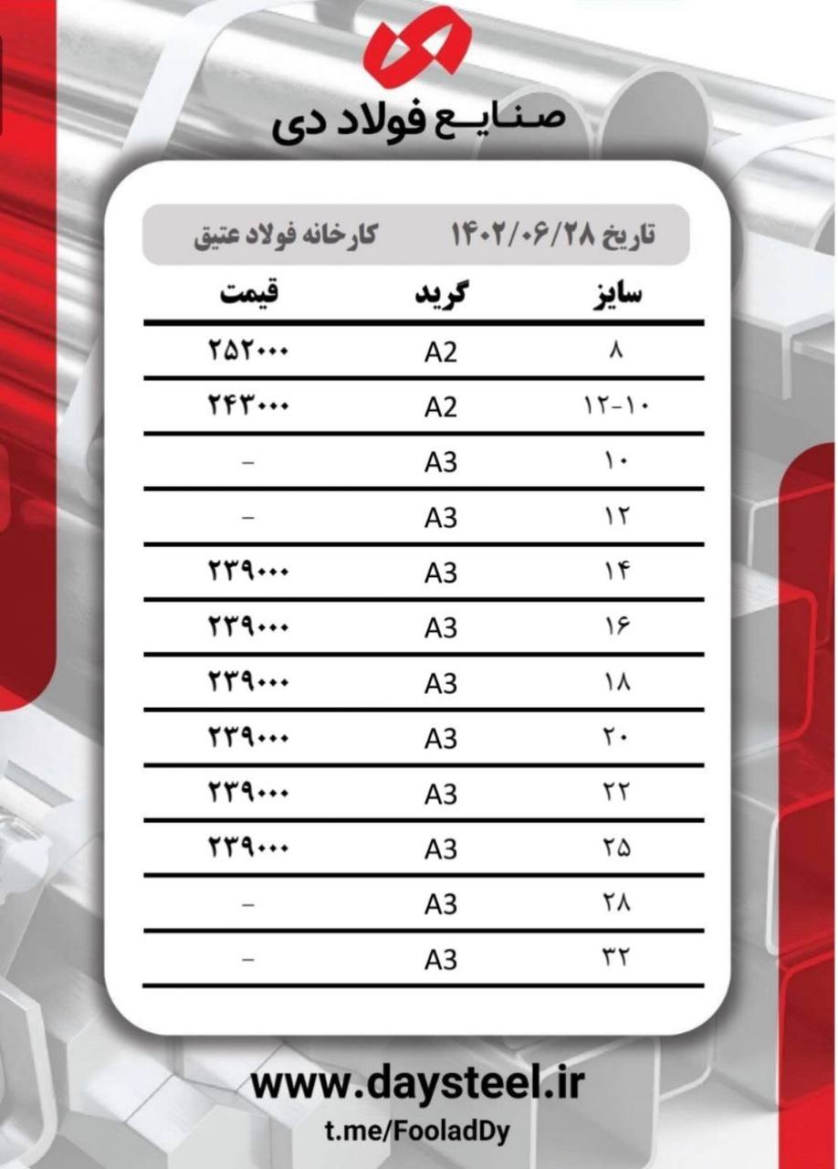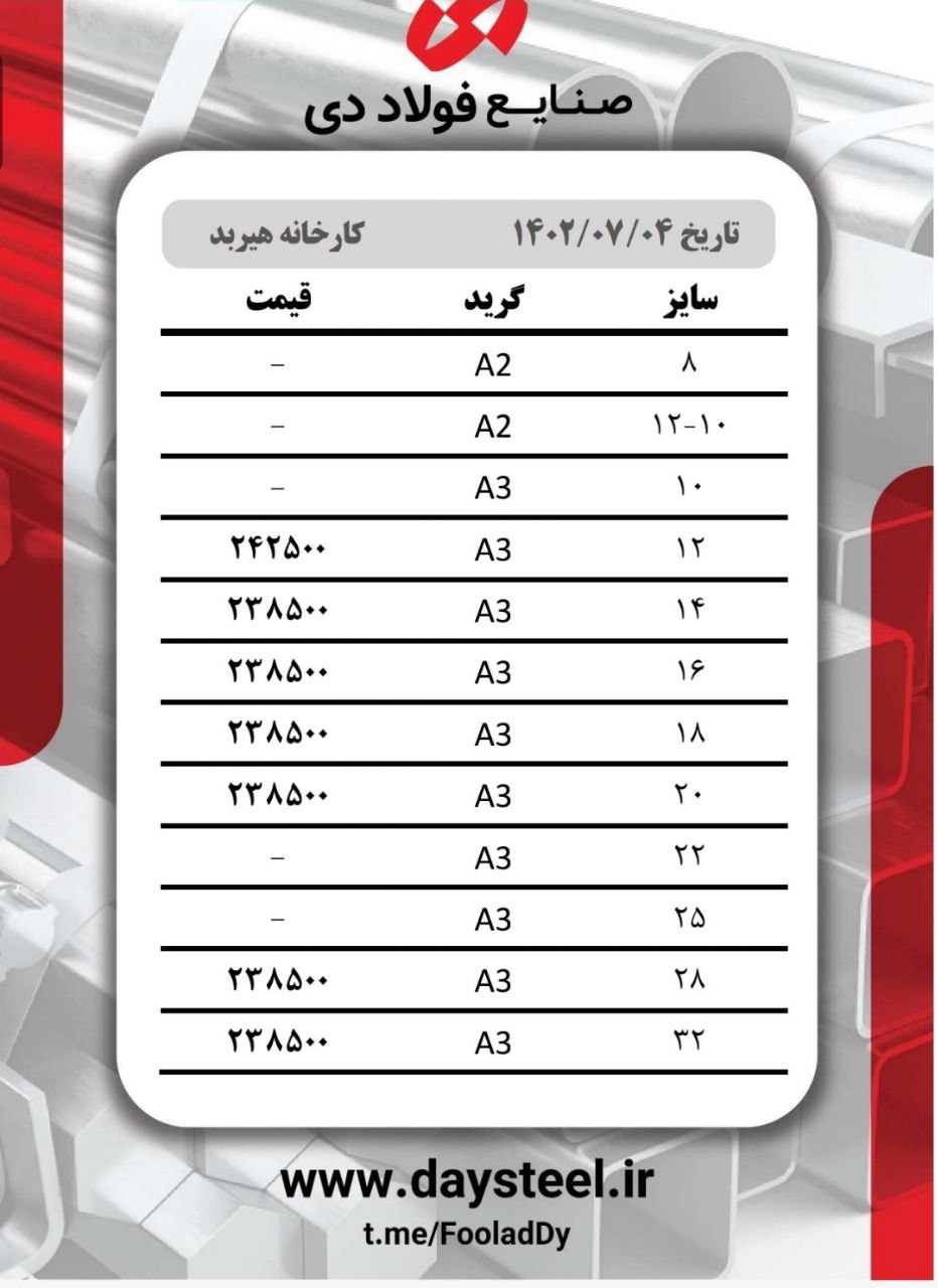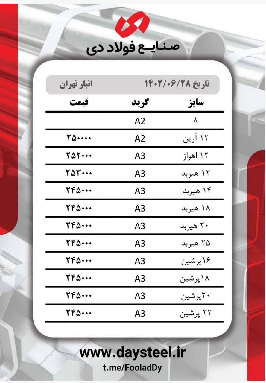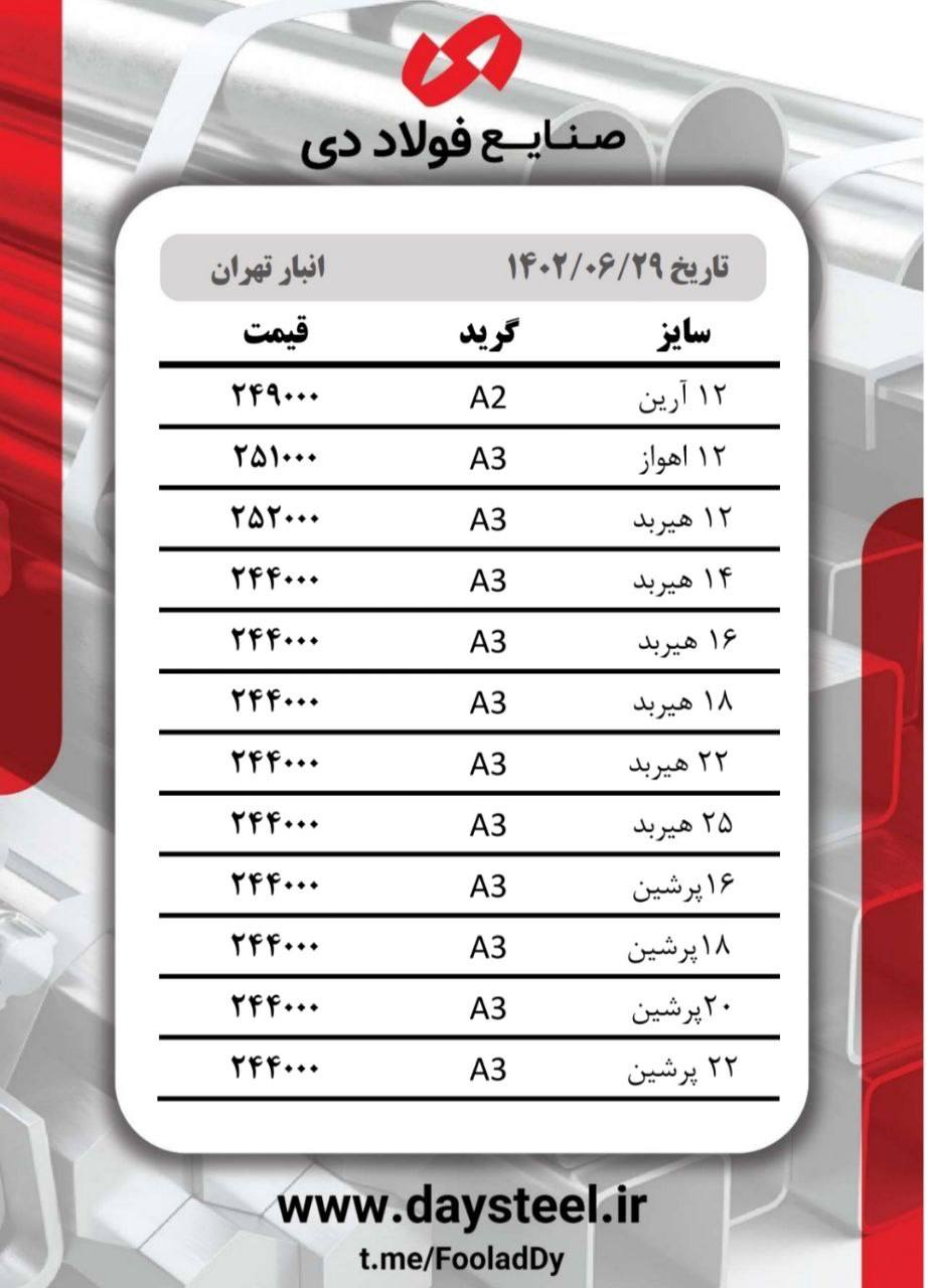 #شرکت_صنایع_فولاد_دی🔸3 میل مبارکه ۳۴۹۰۰۰ 🔸4 میل مبارکه ۳۴۹۰۰۰ 🔸5 میل مبارکه ۳۳۸۰۰۰ 🔸6 میل مبارکه ۳۳۸۰۰۰ 🔸8 میل مبارکه ...