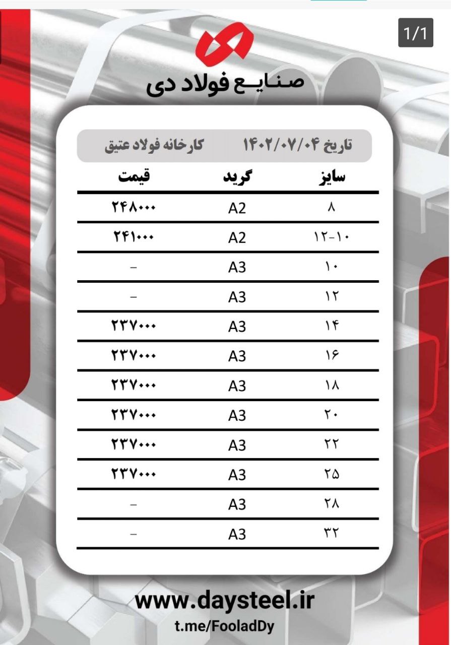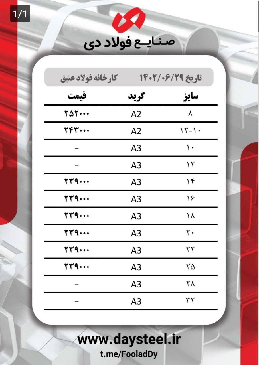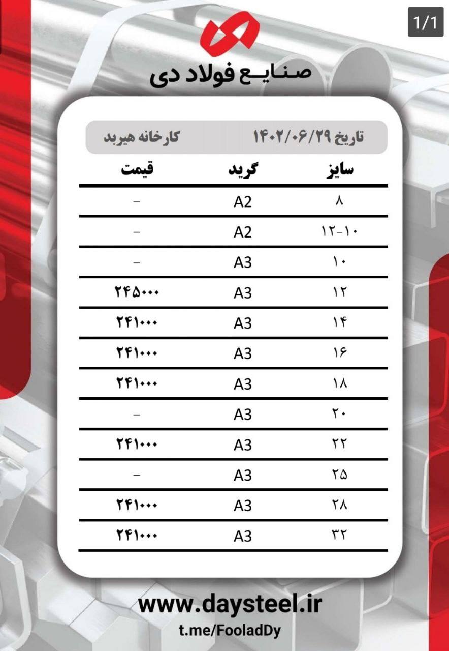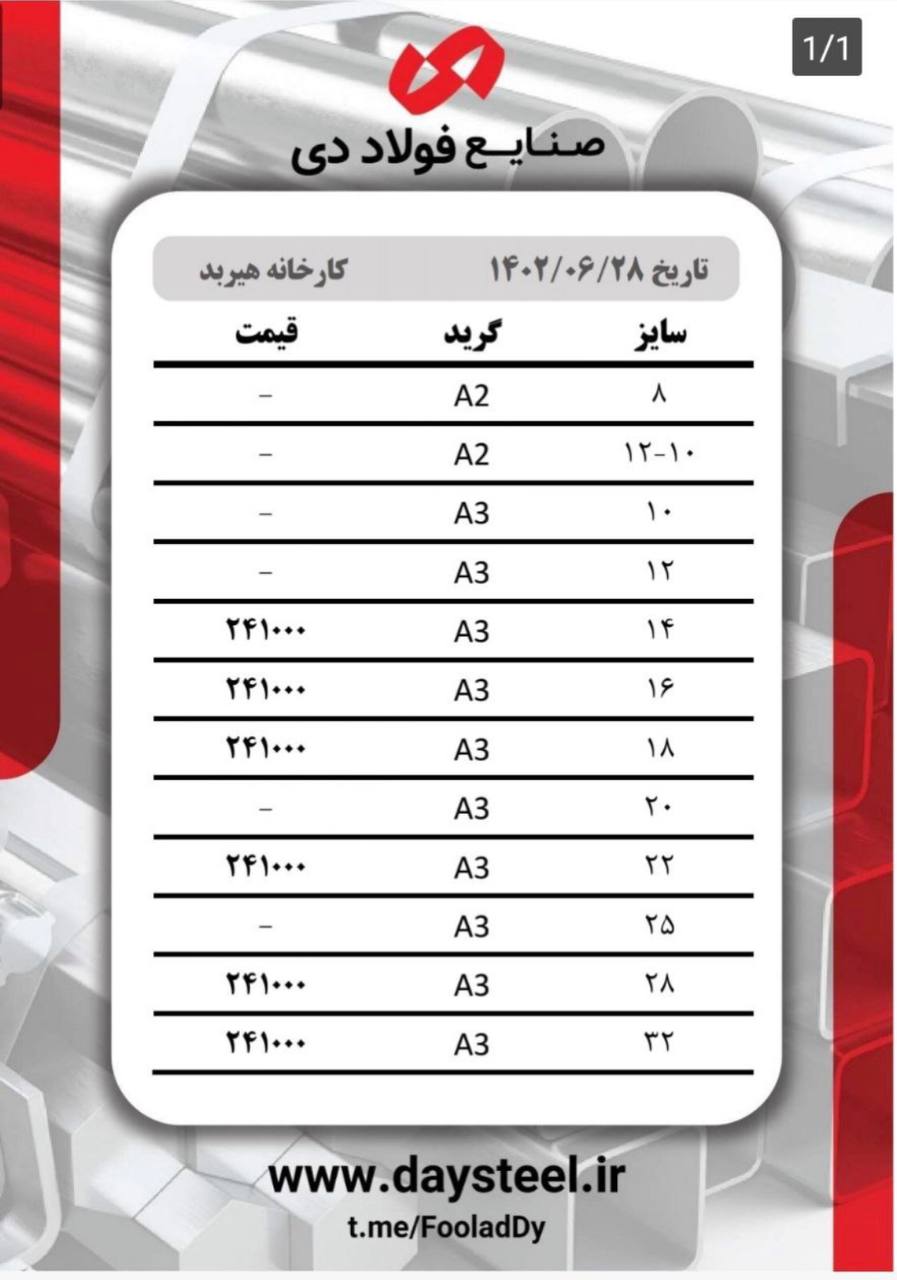 #شرکت_صنایع_فولاد_دی🔸3 میل مبارکه ۳۴۷۰۰۰ 🔸4 میل مبارکه ۳۴۷۰۰۰ 🔸5 میل مبارکه ۳۳۶۰۰۰ 🔸6 میل مبارکه ۳۳۶۰۰۰ 🔸8 میل مبارکه ...