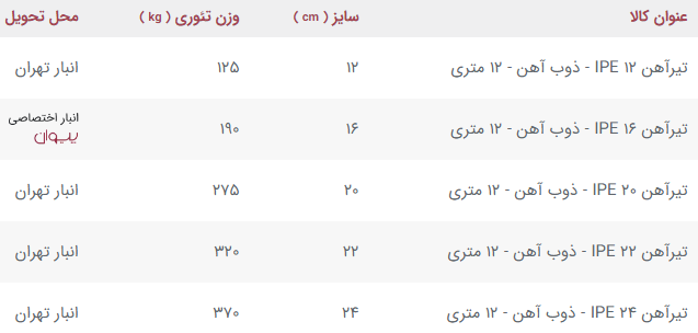 🗓 سه شنبه 21 آذر ماه 1402 👈 تیرآهن IPE طول ۱۲ متر تیرآهن 14 ذوبی ⬅️ 4.200.000 تومان تیرآهن 16 ذوبی ⬅️ 5.200.000 تومان تیرآهن 18 ذوبی ⬅ ...