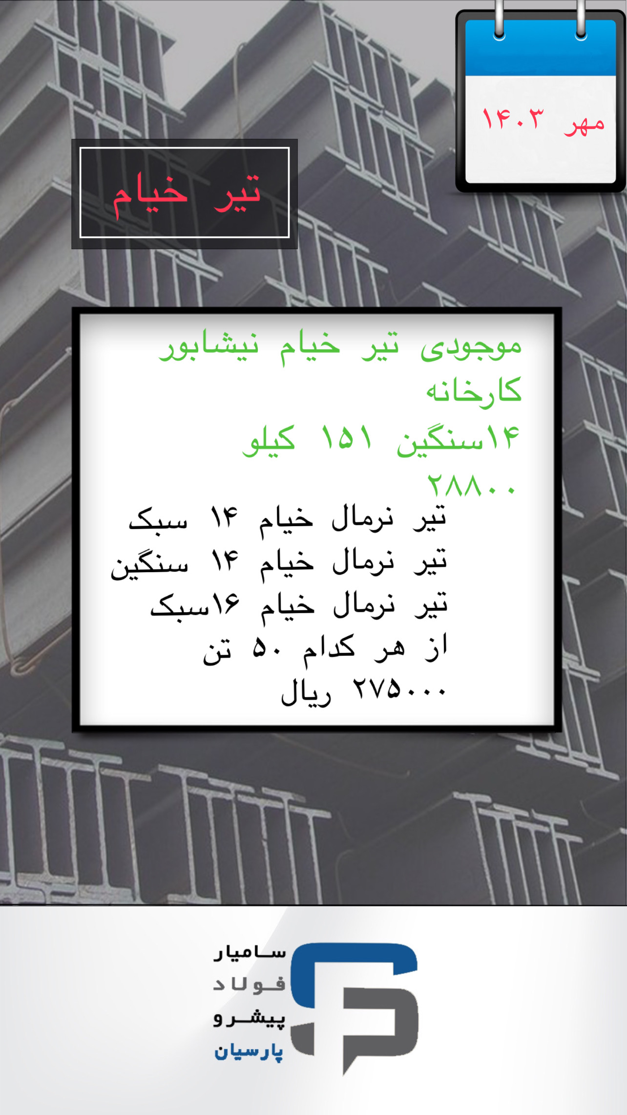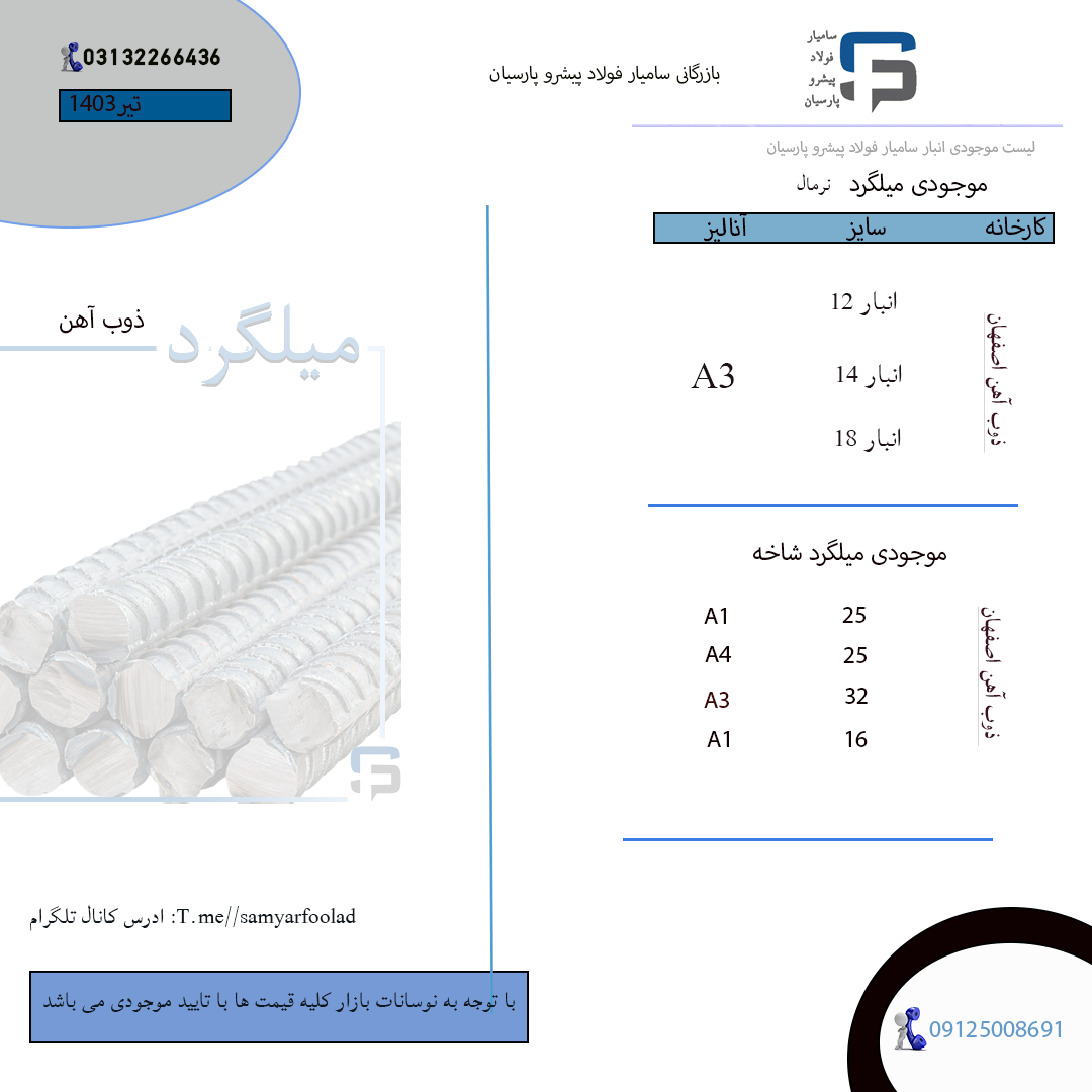 موجودی میلگرد نرمال ذوب اهن اصفهان ١۴ کارخانه٢۵٩٠٠ ١۴ انبار ٢۴٩٠٠ زرد بار ١٨ کوتاه انبار ٢٣٨٠٠انبارداری ١٣٠ظرفیت موجود ٢٨ انبار ٢۴٩٠٠موجود ١٢ تن ١٢ انبار ٢۵۴٠٠ ١٢ کارخانه ٢۵۵٠٠ میلگردهای ١۴ متری ١٢ انبار ٢٩٠٠٠ ١۶ ذنبار ٢٨۶٠٠ ٢٠انبار ٢٨٧٠٠ ٣٢ انبار ٢٩٢٠٠ ٣٢ شاخه انبار ٣٠١٠٠ ٢۵ گرید آ۴. ٣٠٢٠٠ ٢۵ آ١ ظرفیت انبار ٣١۶٠٠ ١۶ آ١ ظرفیت ذوب ٣٠۶٠٠
