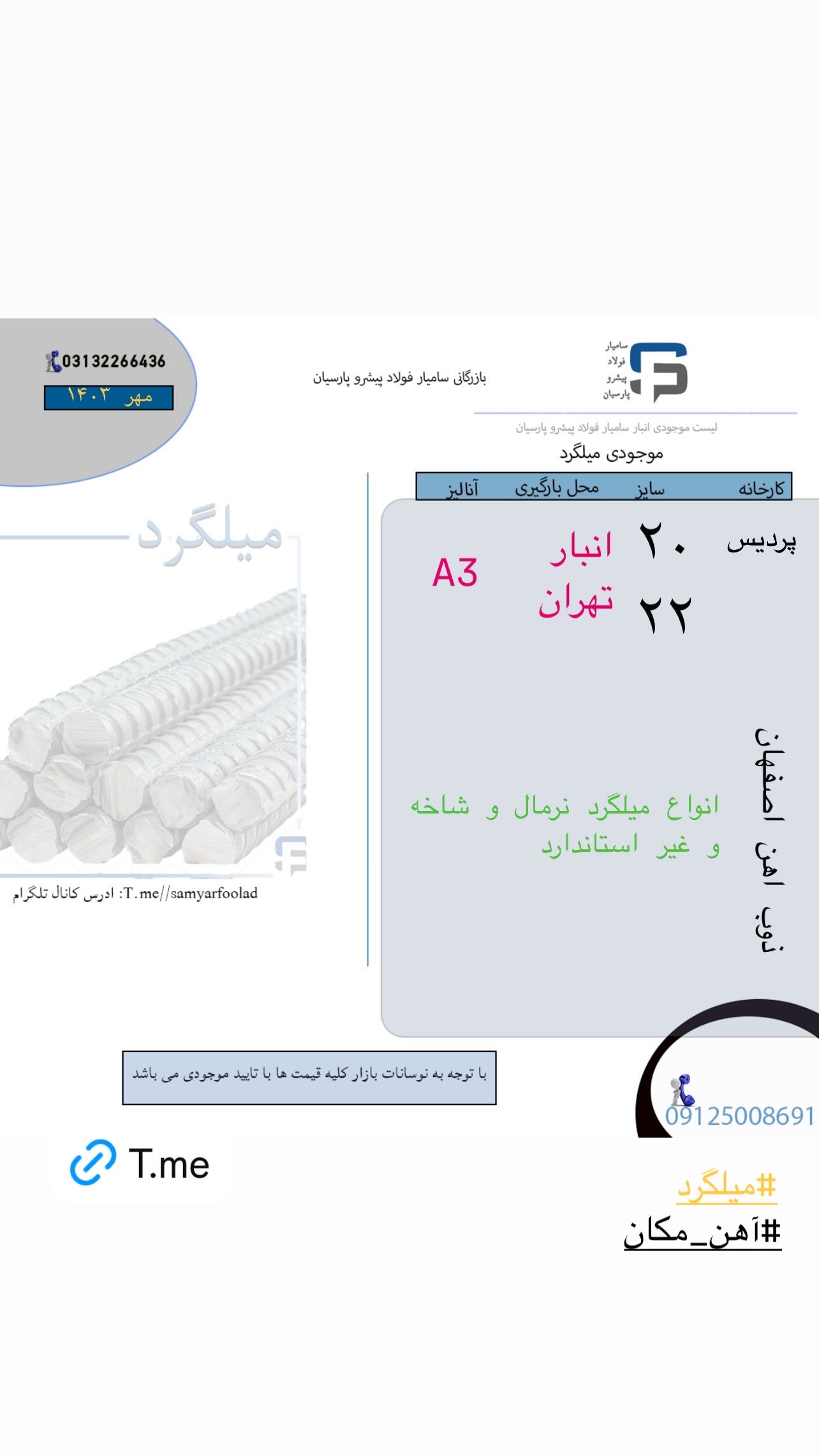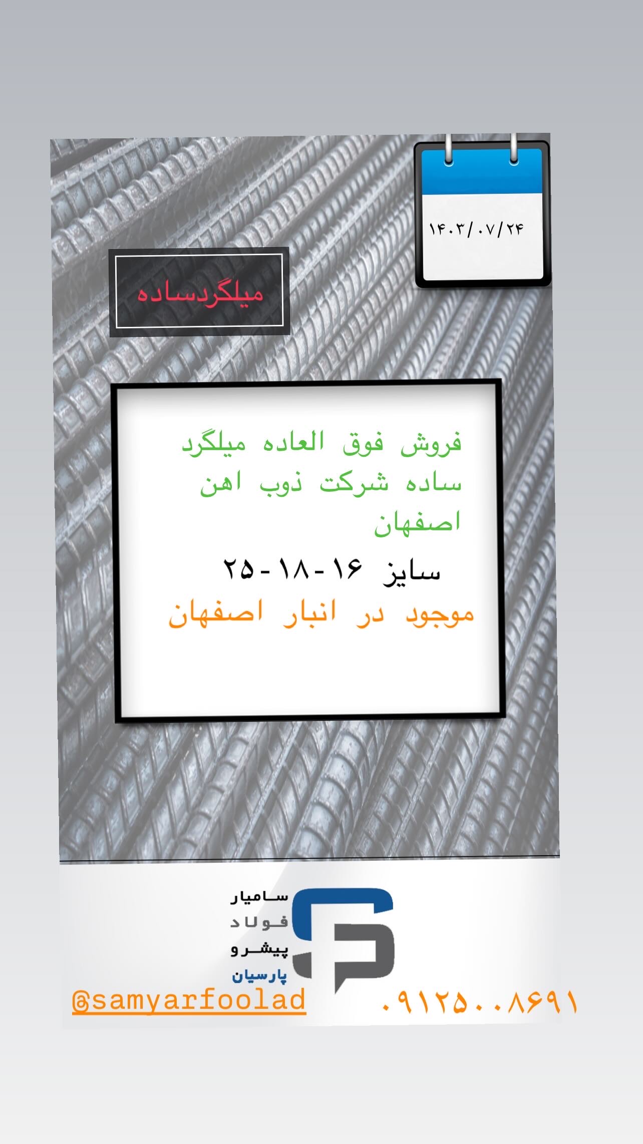 میلگرد سایز 25 گرید A1 سازنده :شزکت ذوب اهن اصفهان محل بارگیری :انبار اصفهان موجودی :یک ظرفیت میلگرد کلاف 10 کویر گرید 1008 موجودی یک ظرفیت محل بارگیری :انبار اصفهان تلگرام شرکت :SAMYARFOOLAD