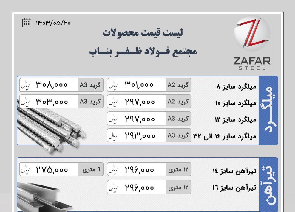 آذر فولاد امین تیکمهداش میلگرد آجدار A2 سایز 8: 305000 میلگرد آجدار A2 سایز10: 300000 میلگرد آجدار A3 سایز 12: 300000 میلگرد آجدار A3 سایز 14 الی 32 : ...