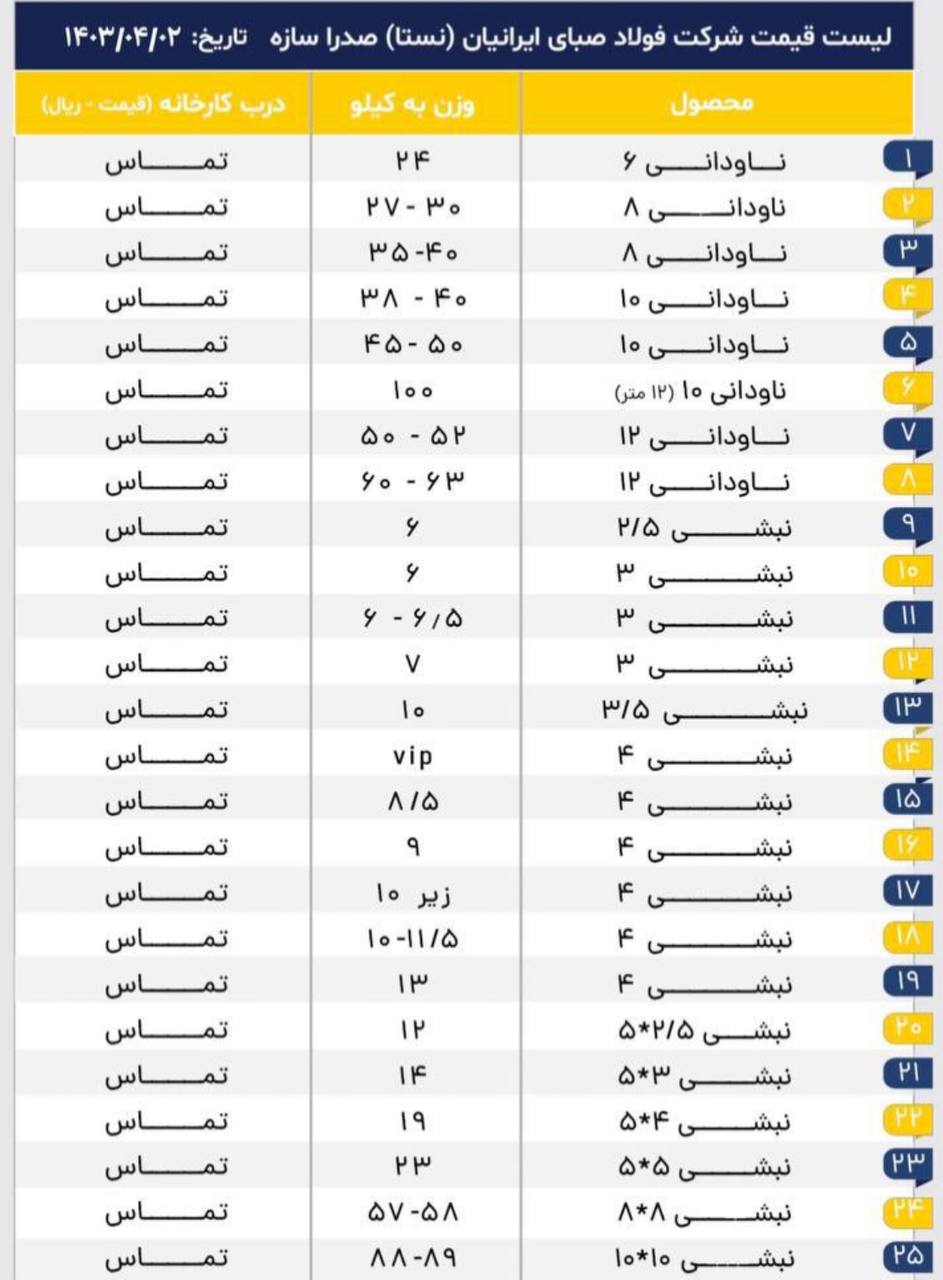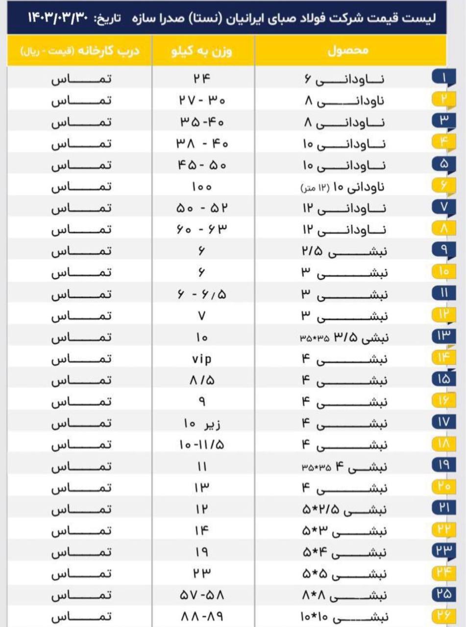 فولاد درپاد تبريز . ١٤٠٣/٠٣/٣٠ سایز8 : ٢٨٠٠٠٠ ◽️ سایز 10 و 12 : ٢٧٧٠٠٠. ◽️ سایز 14 تا 25 : ٢٧٤٠٠٠. ◽️ https://t.me ...