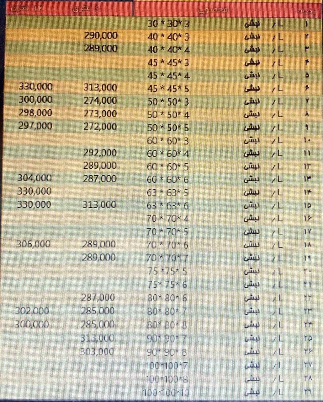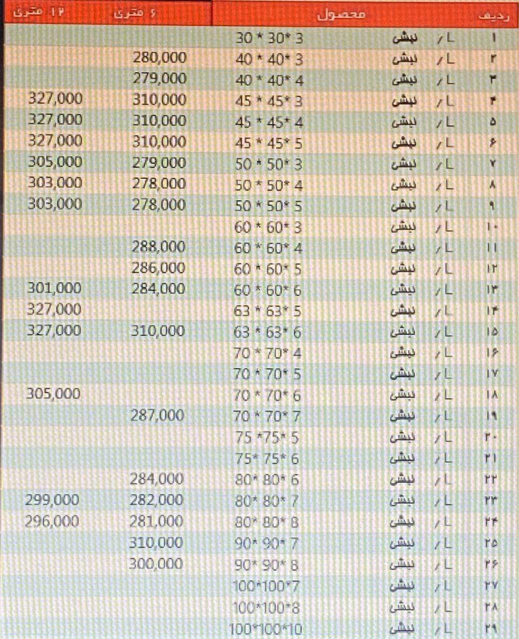 صنایع آذر فولاد امین ۱۴۰۳/۰٢/۰۴ ۱۰ A³ : _◽️ ۸ A² : ٢٨٤٠٠٠◽️ ۱۰ A² : ٢٧٩٠٠٠ ◽️ ۱۲ A³ : ٢٧٩٠٠٠ ◽️ ۱۴~۳۲ A³ :٢٧٣٠٠٠ ◽️ بارگیری ...