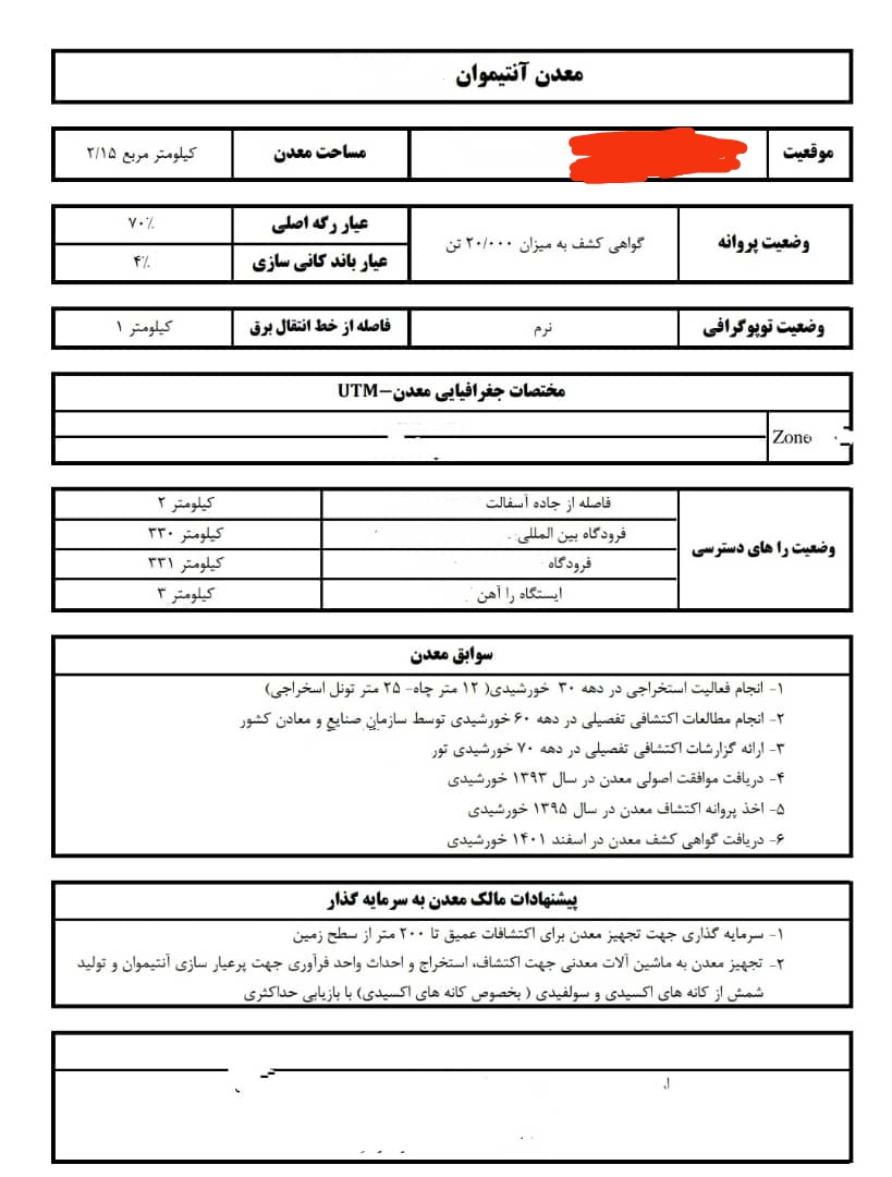 یک واحد معدن آنتیموان دارای آنالیز و آماده بهره برداری واگذار میگرددلذا جهت استعلام قیمت و اطلاعات بیشتر تماس حاصل فرمایید