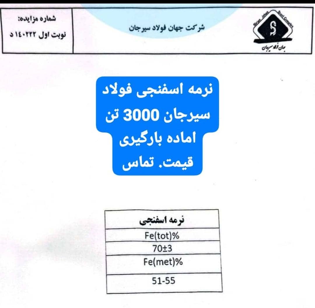 نرمه اسفنجی فولادسیرجان بارگیری از کارخانه مقدار ۳۰۰۰ تن رسمی و غیررسمی قیمت ۴۹۳۰ تومن