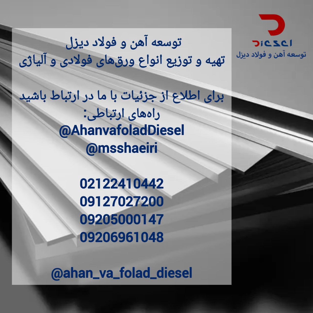 توسعه آهن و فولاد دیزل تهیه و توزیع انواع ورقهای فولادی و آلیاژی قیمت :41,600 برای اطلاع از جزئیات با ما در ارتباط باشید راههای ارتباطی: تلگرام: @Ahanvafol ...