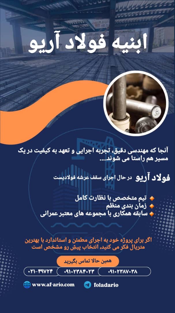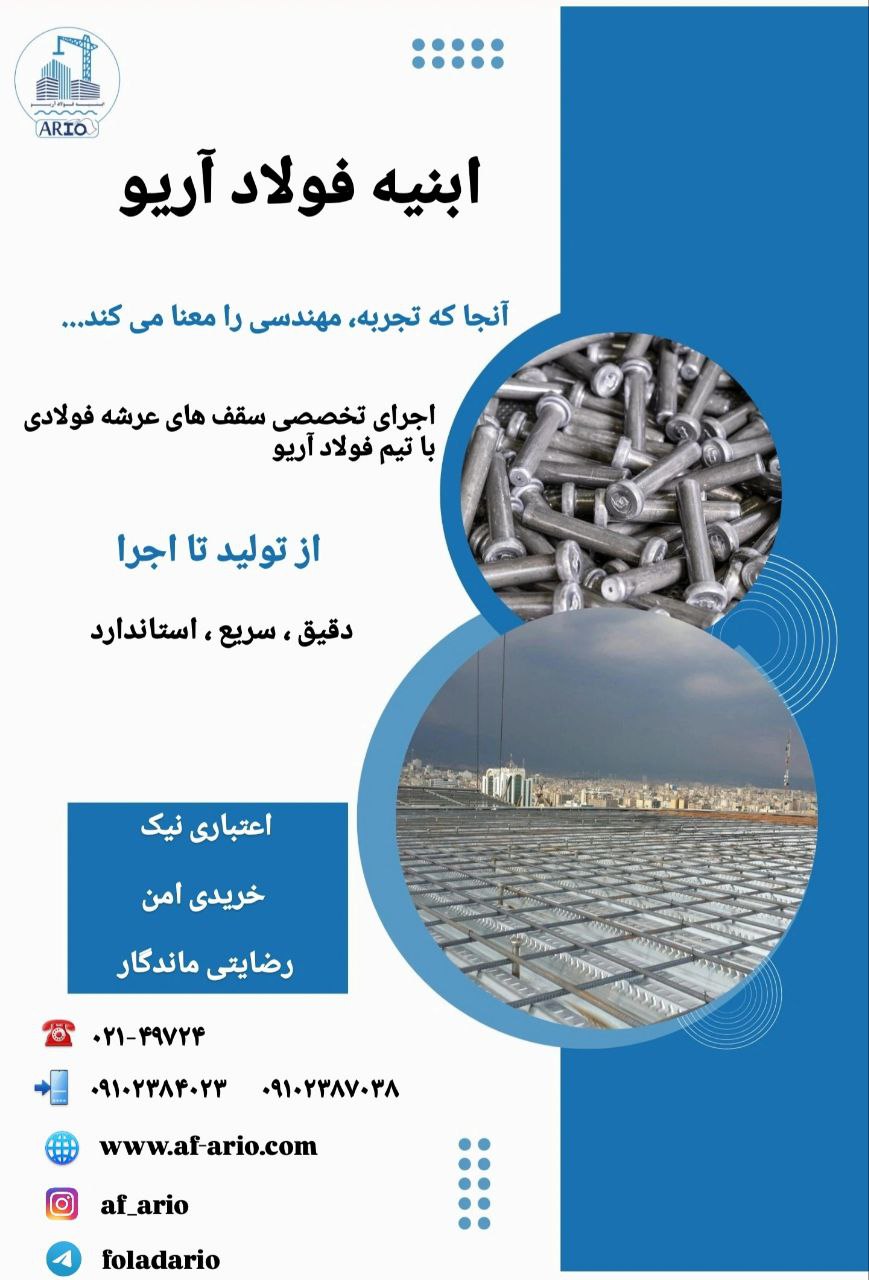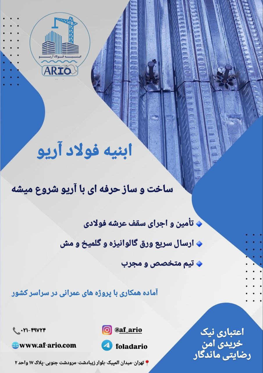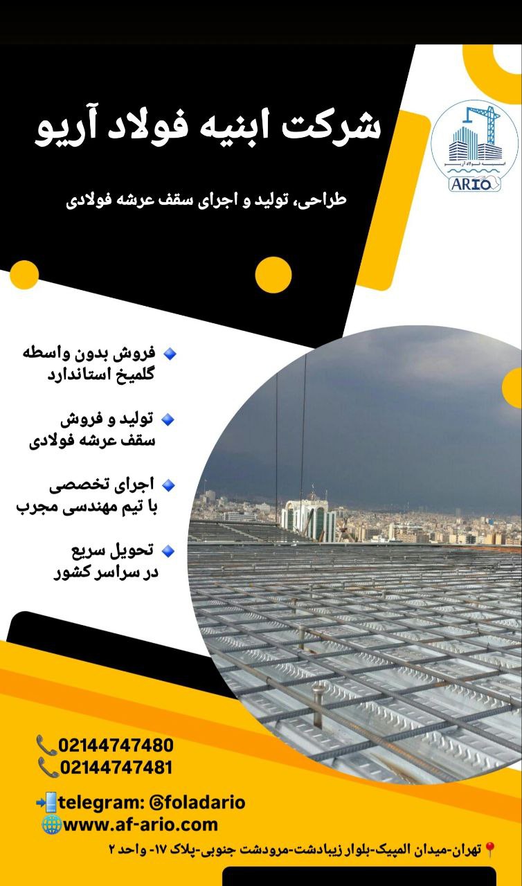 #ابنیه_فولاد_آریو ✨ تامین کننده انواع ورق گالوانیزه و رنگی (در طرحهای عرشه فولادی، شادولاین، کرکره و ...) ✨ عاملیت فروش گلمیخ فولاد آلیاژی ✨مجری تخصصی ...