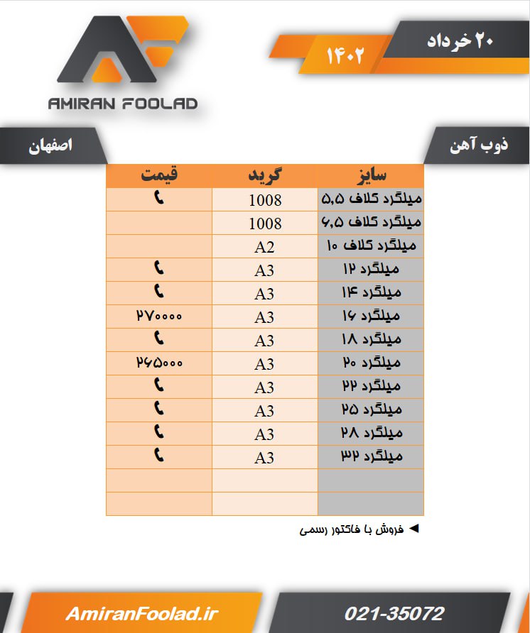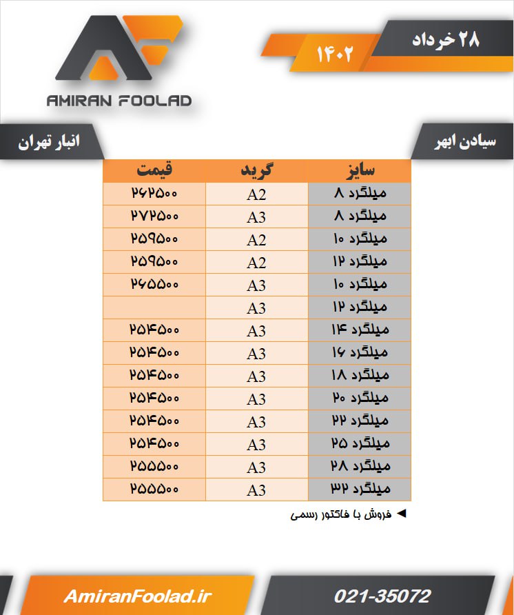 شرکت آذرفولاد امین میلگرد آجدار A3 سایز ۱۰ ۲۶۵۰۰۰﷼ میلگرد آجدار A2 سایز ۸ ۲۶۵۰۰۰﷼ میلگرد آجدار A2 سایز۱۰ ...