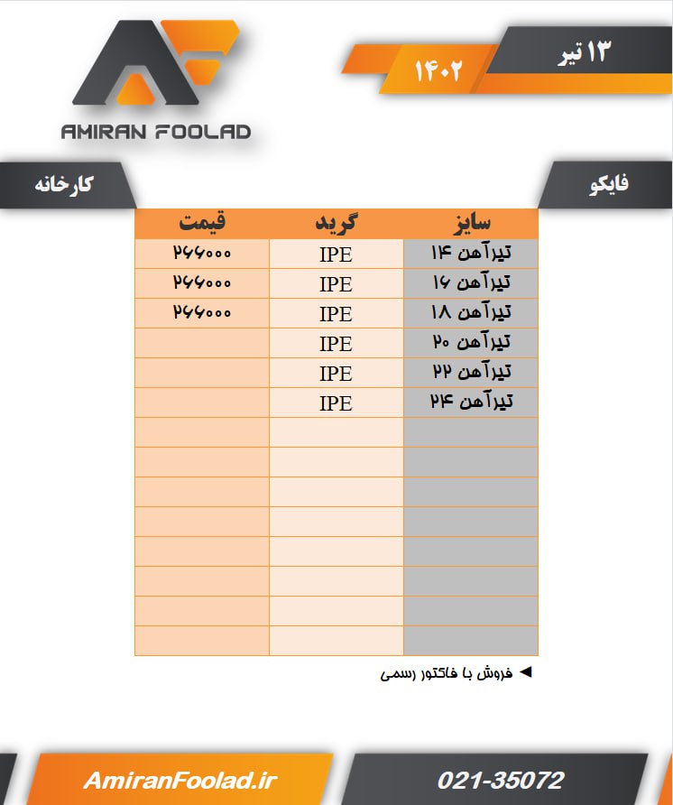 تیرآهن فایکو کارخانه جهت اطلاع از تخفیفات و شرایط فروش تماس حاصل بفرمایید.