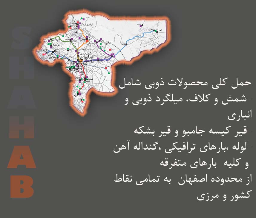 شرکت حمل و نقل شهاب اصفهان رتبه دوم ذوب آهن و ارائه خدمات در کلیه سطوح حمل و نقل داخلی و صادرات شمش و قیر، ریل، چدن، ورق، لوله، بار ترافیکی و ... دارد. Shahab T ...