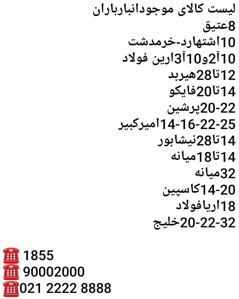 💠 #شرکت_آرتا_تجارت_افق_باران #امیراباد 6/5امیراباد #ملایر 6/5ملایر #ابهر 8ابهر 10ابهر #عتیق 14عتیق 16عتیق 18عتیق #شمس 12شمس #آرین_فولاد 10ارین فولاد 12ارین ...