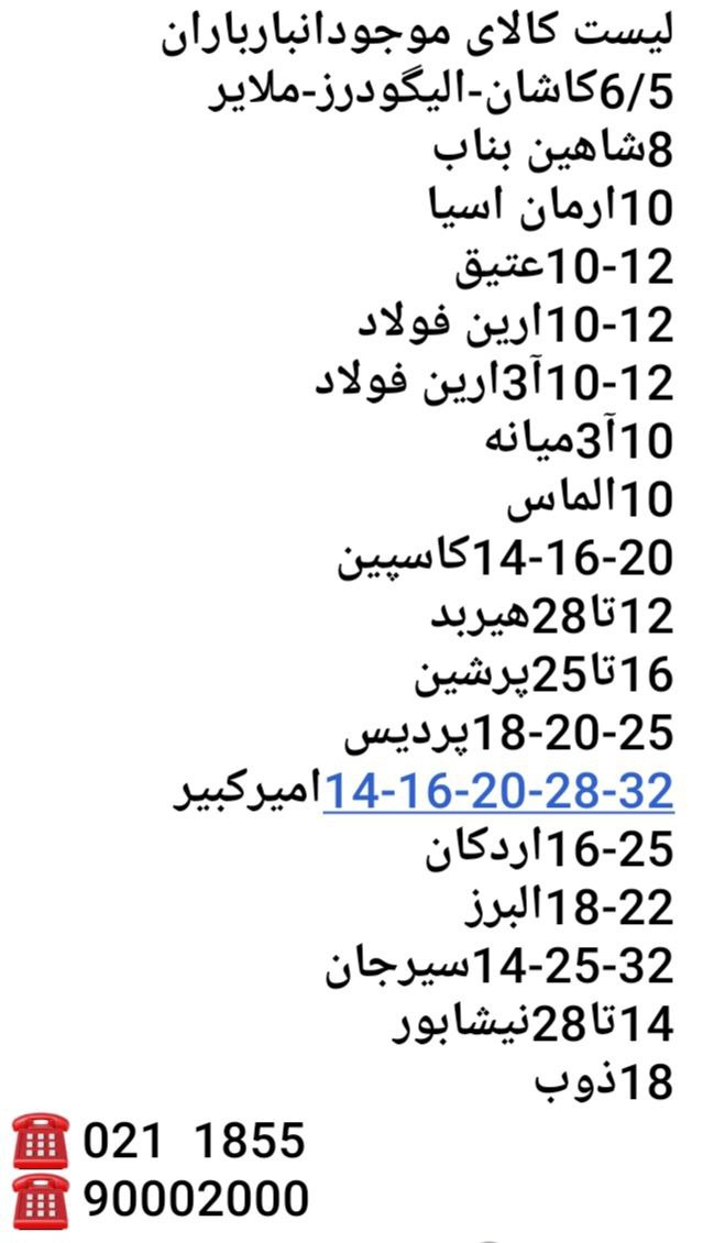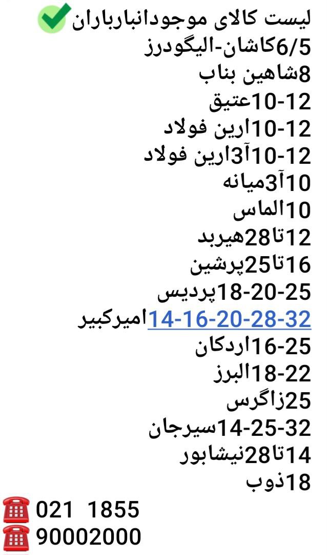#فولاد_باران ↖️کلیه اجناس فوق موجوددرانبار باران میباشد↖️ #شرکت_آرتا_تجارت_افق_باران فروش تخصصی #میلگرد در انبار تهران و کارخانه ☎️ 021 1855 ☎️ 90002000 1402 ...