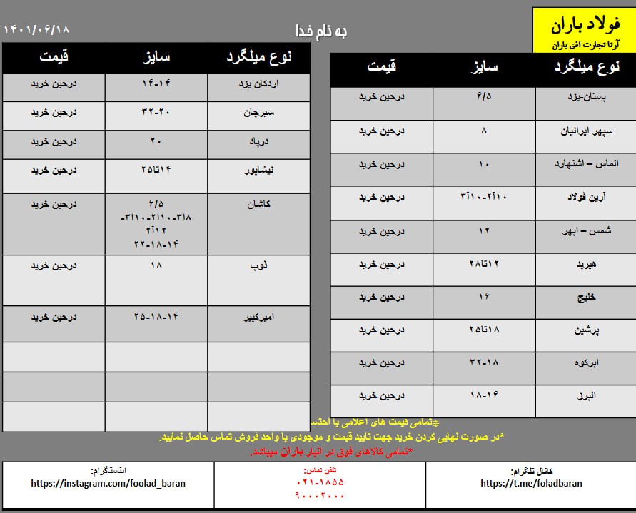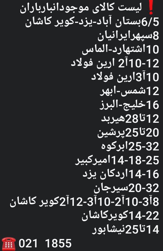 6/5کاشان 25900 8آ3کویر کاشان 27000 10آ3ارین فولاد 25700 10آ2کاشان 25800 12آ2کاشان 25600 🔹 موجوددرانبار باران🔹 https://t.me/foladbaran