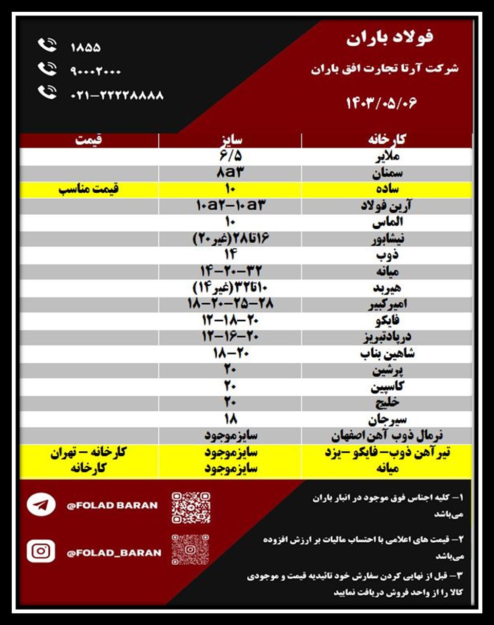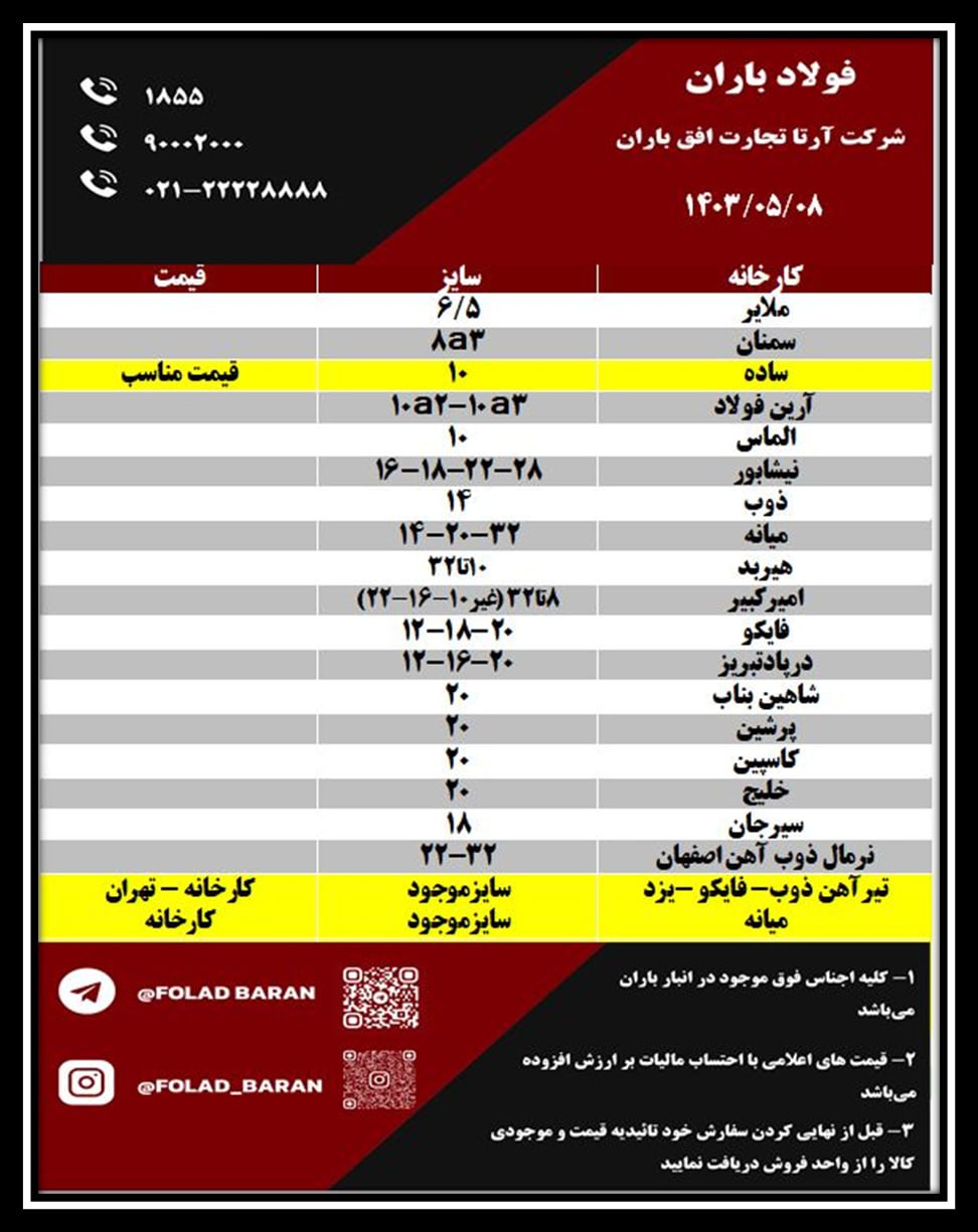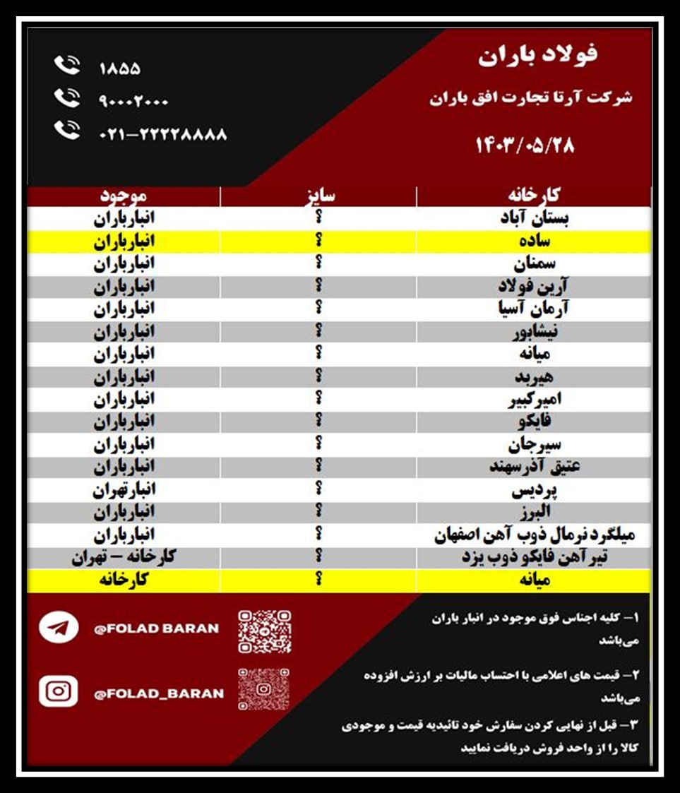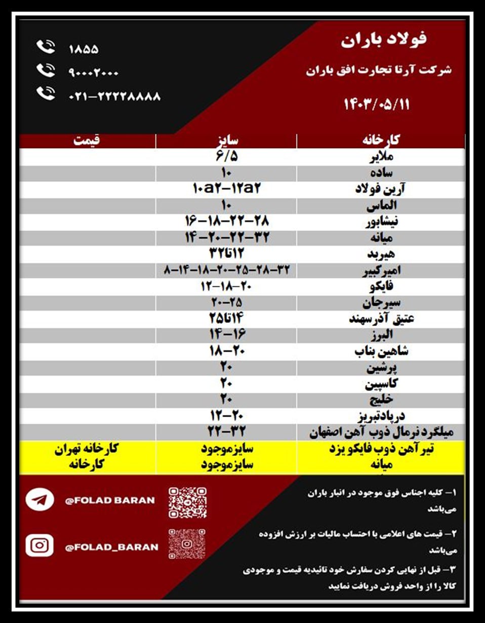 لیست کالای موجود در انبار باران ✔️ فولادباران مدیریت بارانی ☎️1855 ☎️90002000 ☎️021-22228888 امیرآباد 6/5 سمنان 8آ3 آرین فولاد 10ا2-10آ3-12آ2 شاهین بناب 12آ3 ...