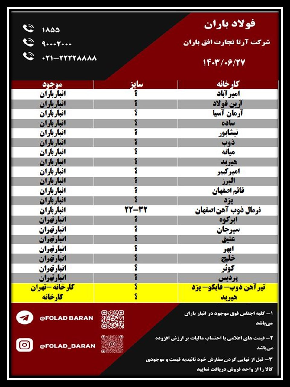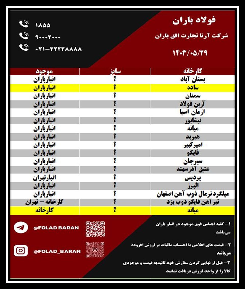 لیست کالای موجود در انبار باران ✔️ فولادباران مدیریت بارانی ☎️1855 ☎️90002000 ☎️021-22228888 سمنان آرین فولاد آرمان اردبیل خرمدشت نیشابور فایکو هیربد امیرکبی ...