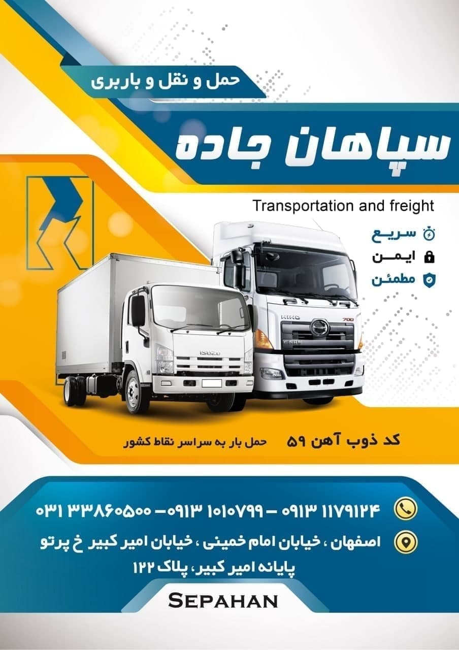 حمل و نقل و باربری #سپاهان_جاده با بیش از 30 سال سابقه 🔸حمل بار به سراسر کشور ☎️031 33860500 📱09131179124 📱09131010799 https://foolad24.com/profile/3590