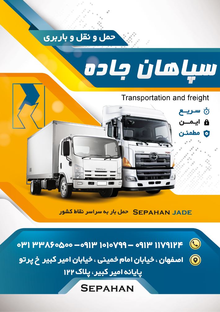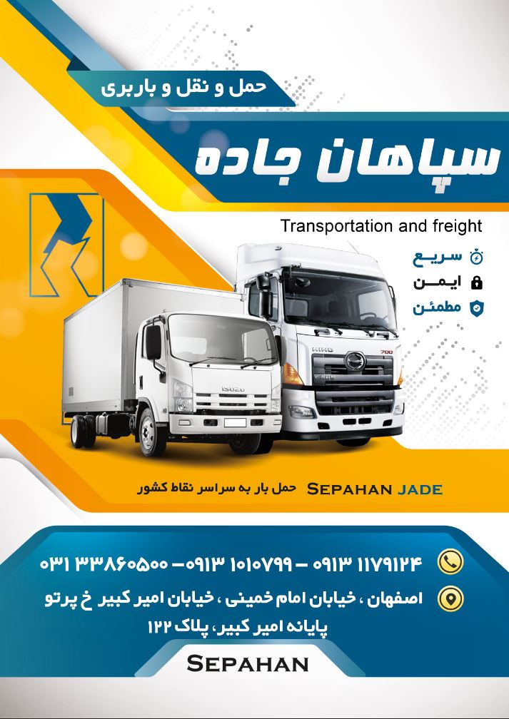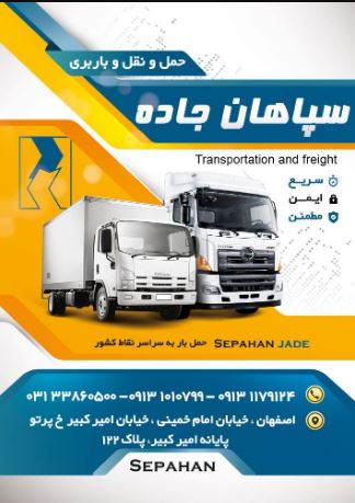 حمل و نقل سپاهان جاده با بیش از ۳۰ سال سابقه اصفهان . خیابان امام خمینی . خیابان امیر کبیر. خ پرتو. پایانه امیر کبیر. پلاک ۱۲۲ آقای خانجانی حمل تیر اهن و پروفی ...