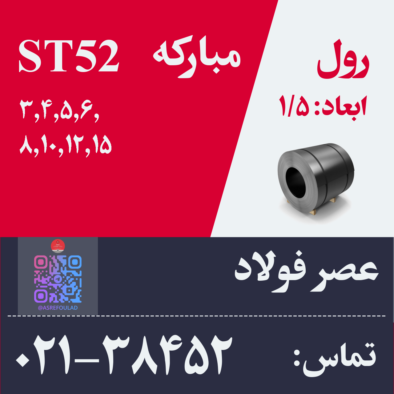 🔴رول #مبارکه #ST52 ————————- 3 میل عرض 1.5 4 میل عرض 1.5 5 میل عرض 1.5 6 میل عرض 1.5 8 میل عرض 1.5 10 میل عرض 1.5 ...