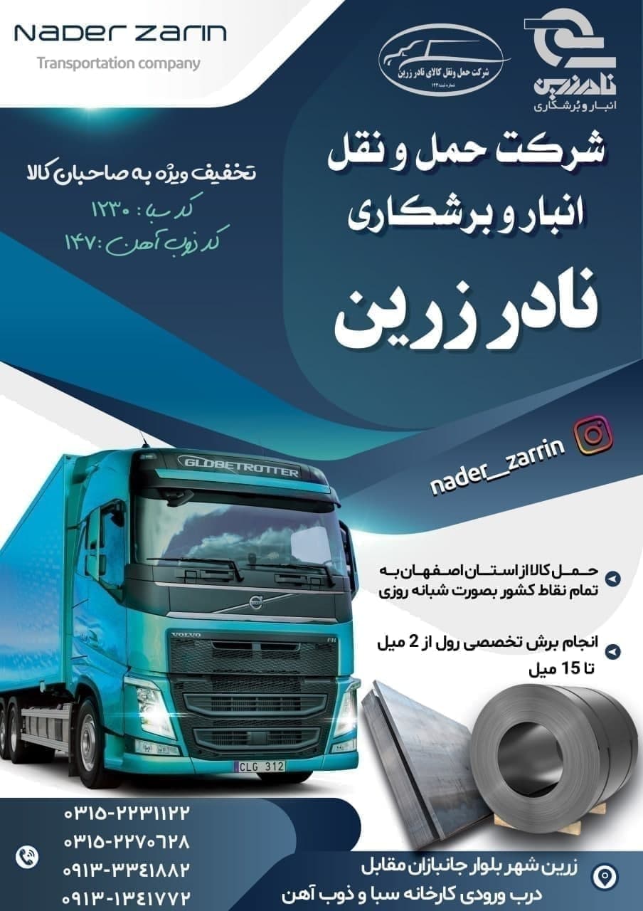 #نادر_زرین #شرکت_حمل_نقل_انبارداری_برشکاری_کالای_نادر_زرین ✅ دارای کد فولاد سبا : ۱۲۳۰ ✅ کد ذوب اهن :۱۴۷ 🔹حمل کالا از اصفهان به تمام نقاط کشور 🔹تخفیف ویژه به ...