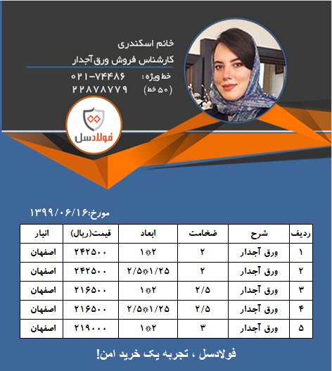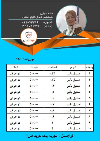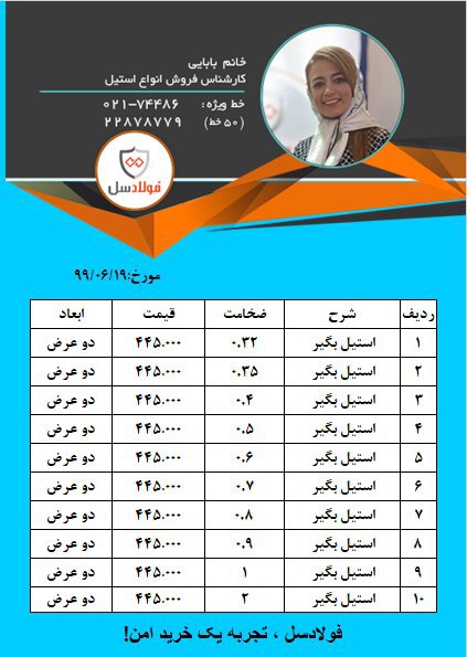 #فولادسل #ورق_استیل کارشناس فروش: خانم بابایی تماس: 09919597404 شرکت: 02174486 داخلی 103 @fooladsell قیمت روزانه ورق استیل بگیر