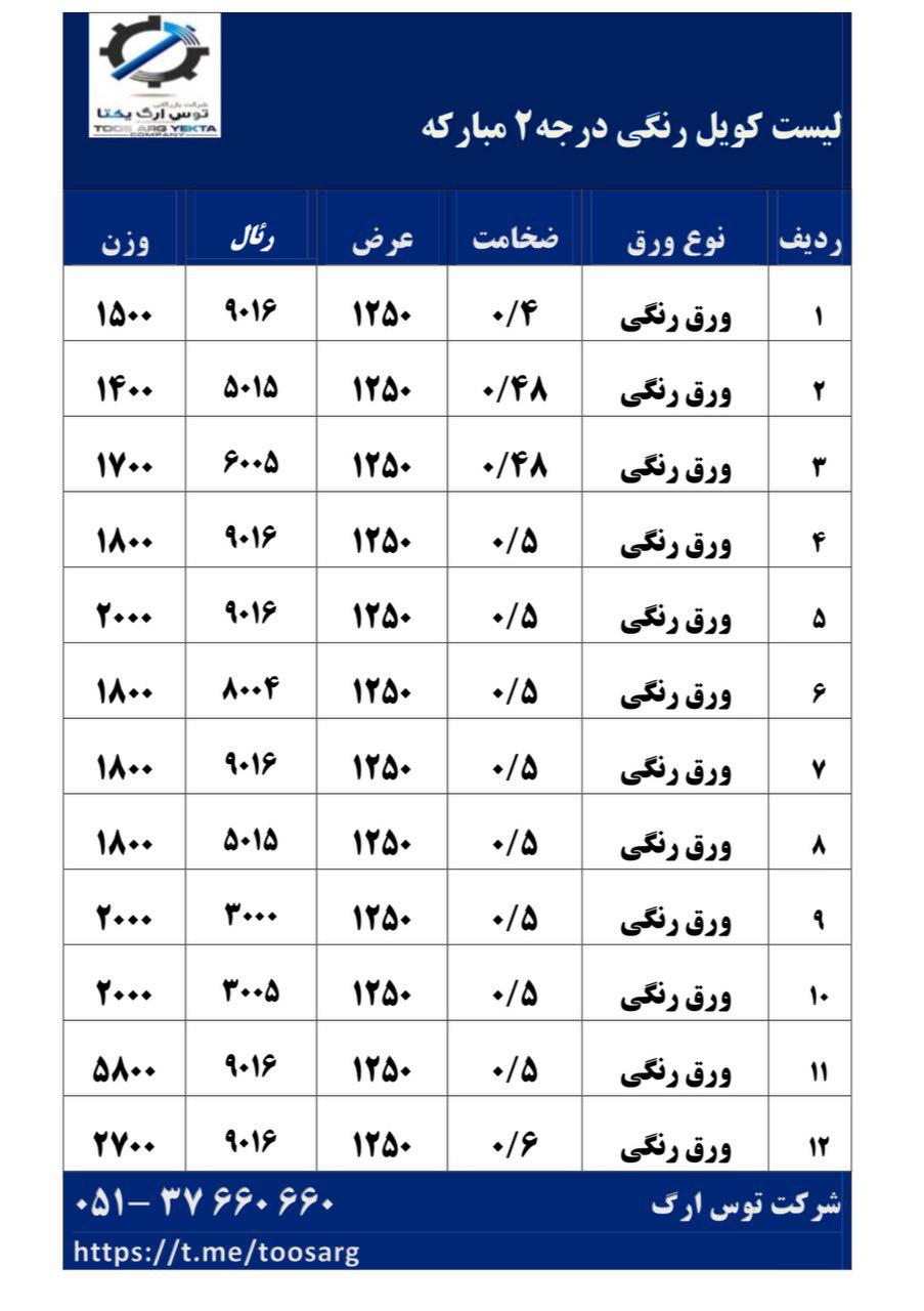 رول رنگي درجه يك اصفهان رول ٠٤٧عرض ١٢٣ (رئال ٥٠١٥). ٩تني رول ٠٥٠عرض ١٢٥٠(رئال ٩٠١٦). ٦/٥تني رول ٠٦٠عرض ١٠٠٠(رئال ٩٠١٦). ٦/٥تني توس ارگ 05137660660