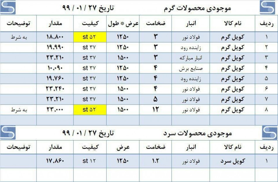کلاف گرم 2*1000 second 2 t 2.6*1210 st33 19 t 3*850 DD13 5t 3*1000 st22 5t 3.3*975 st33 15t انبار اصفهان