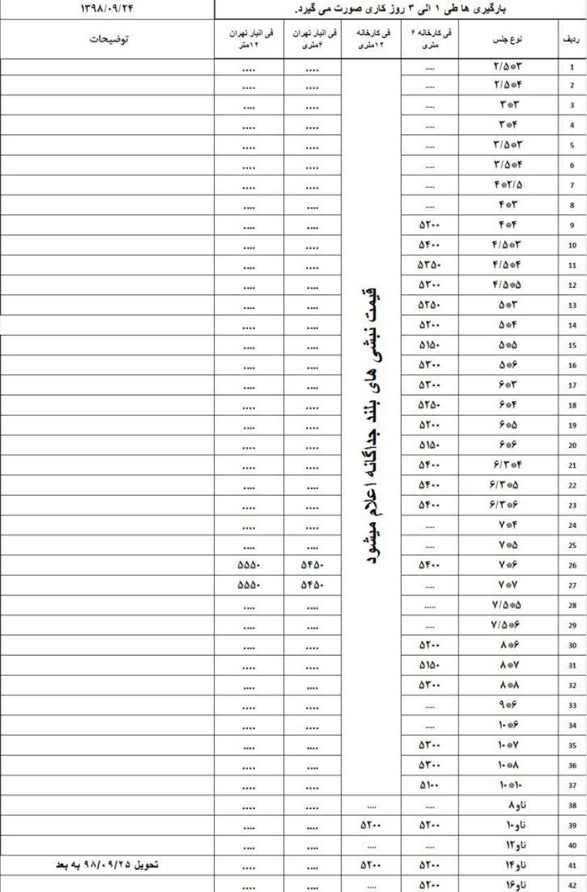 فولاد آناهیتا گیلان : ثابت میلگرد ۸ ۴۶۰۰ میلگرد ۱۰ ۴۵۵۰ میلگرد ۱۲ الی ۳۲ ۴۵۰۰