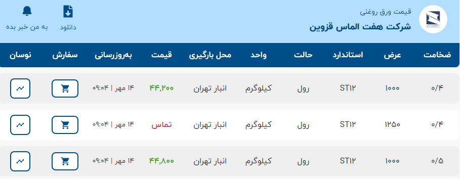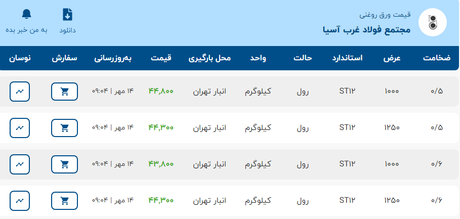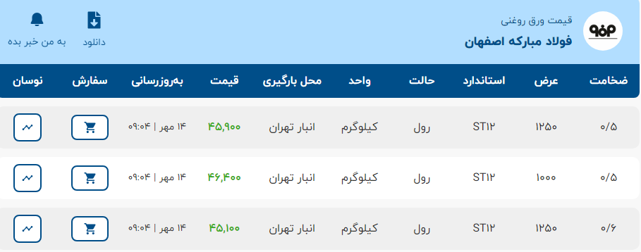 موجود در کارخانه ناودانی ۶ سبک——۳۸۵۰۰۰ ناودانی ۶ سنگین——۳۸۰۰۰۰ ناودانی ۱۰ سبک——۳۹۲۰۰۰ ناودانی ۱۰ سنگین ——۳۸۷۰۰۰ ناودانی ۱۲ سبک ——۳۹۲۰۰۰ ناودانی ۱۲ سنگین ——۳۸۷۰ ...