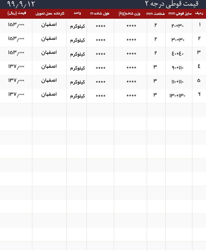 پروفیل ریز بار 40*40 30*30 جمعا :2 تن قیمت :تماس 03191009559 -------------------------------------- درشت بار 13*13 11*11 9*11 جمعا :10 تن 03191009550
