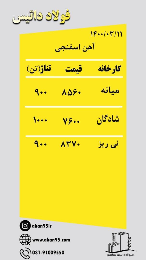 📆سه شنبه 1400/03/11 #آهن_اسفنجی ⛔️ قیمت ها به علاوه 9 درصد ⛔️ ☎️ 031-91009550 ☎️ 09136355007 داخلی 200 و 203 برای مشاهده سایر محصولات کلیک کنید ↪️ htt ...