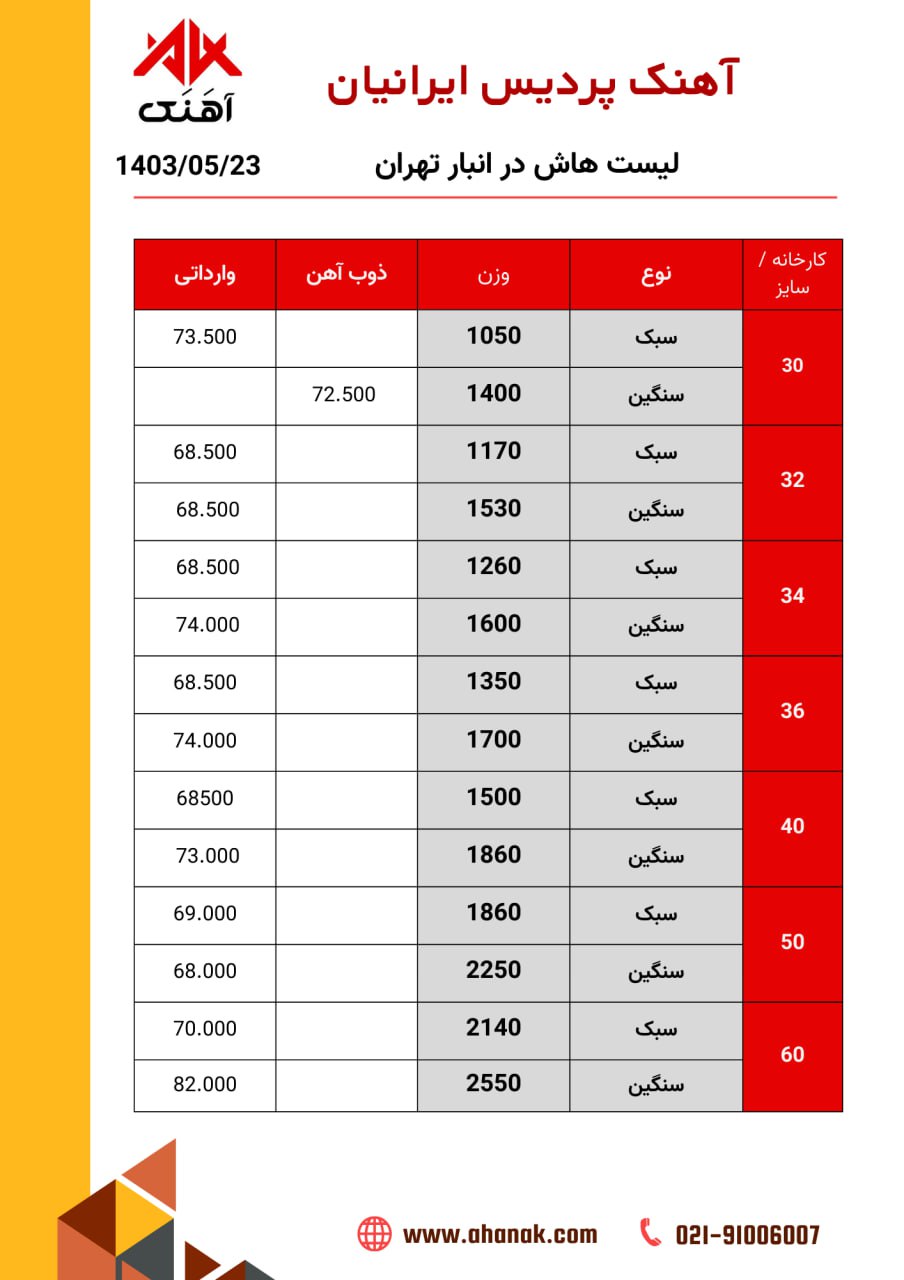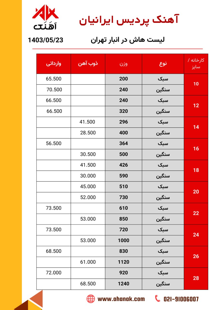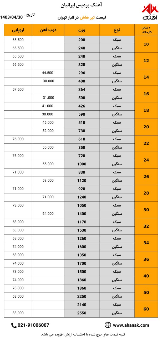 ⏱تاریخ : 30 تیر 1403 🔵 قیمت تیر هاش🔵 🏭 محل بارگیری : انبار تهران 📞 021-91006007 🌐 www.ahanak.com 🆔https://t.me/ahanak