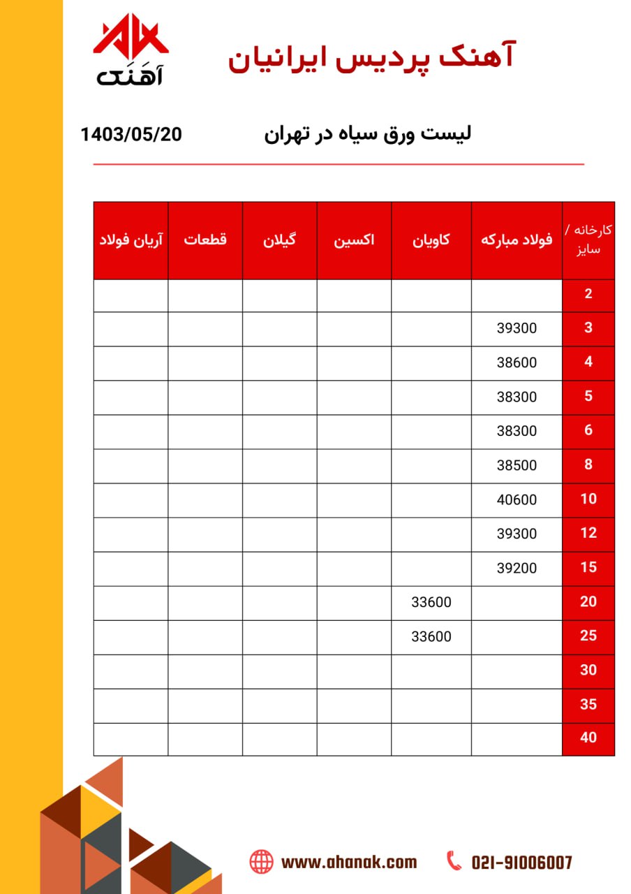 ⏱تاریخ :20 مرداد 1403 🔵 قیمت ورق سیاه 🔵 🏭 محل بارگیری تهران 📞 021-91006007 🌐 www.ahanak.com 🆔https://t.me/ahanak