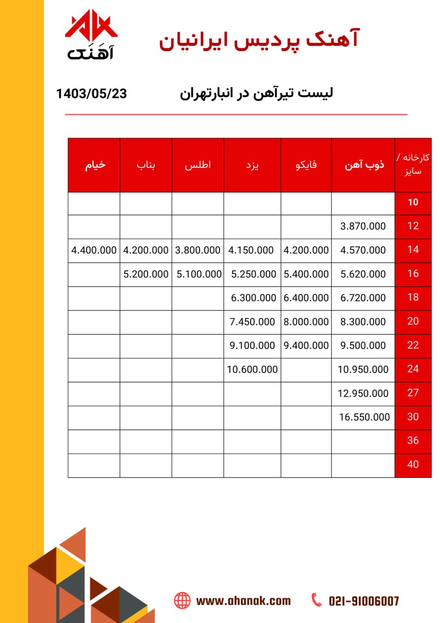 ⏱تاریخ :23 مرداد 1403 🔵 قیمت تیرآهن 🔵 🏭 محل بارگیری تهران 📞 021-91006007 🌐 www.ahanak.com 🆔https://t.me/ahanak