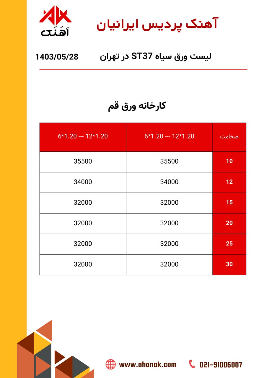 ⏱تاریخ :29 مرداد 1403 🔵 قیمت ورق سیاه ST37 🔵 🏭 محل بارگیری کارخانه 📞 021-91006007 🌐 www.ahanak.com 🆔https://t.me/ahanak
