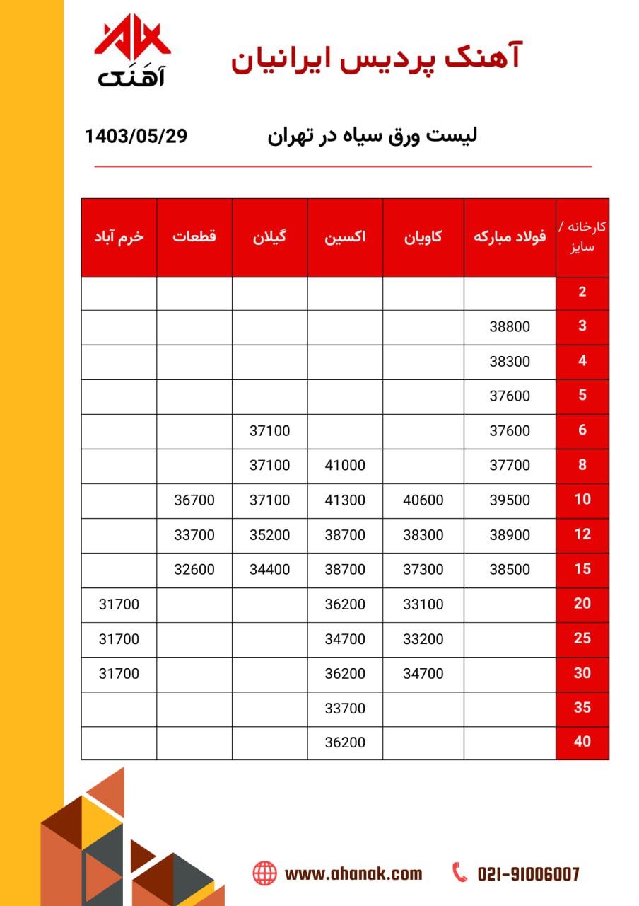 ⏱تاریخ :29 مرداد 1403 🔵 قیمت ورق سیاه 🔵 🏭 محل بارگیری تهران 📞 021-91006007 🌐 www.ahanak.com 🆔https://t.me/ahanak